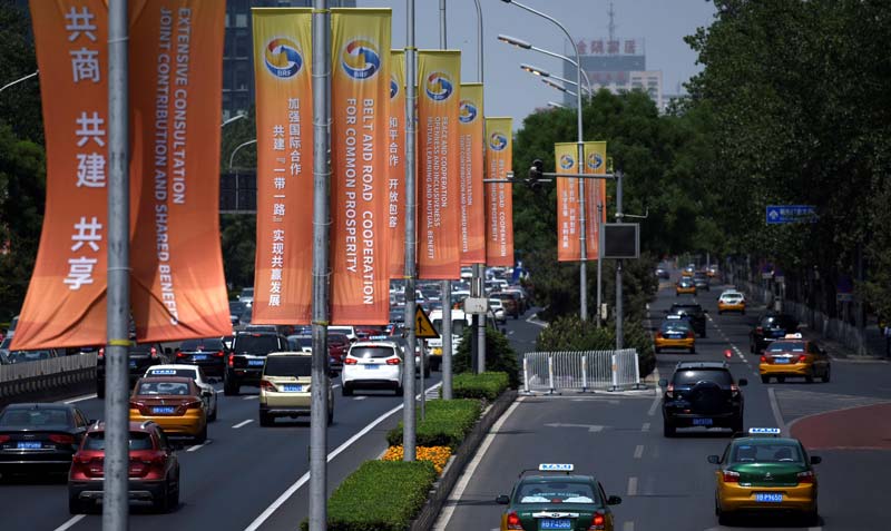 ওবিওআর শিখর সম্মেলন আসছে। তার আগে ব্যানারে সেজেছে বেজিং-এর রাস্তা। ছবি: এএফপি।