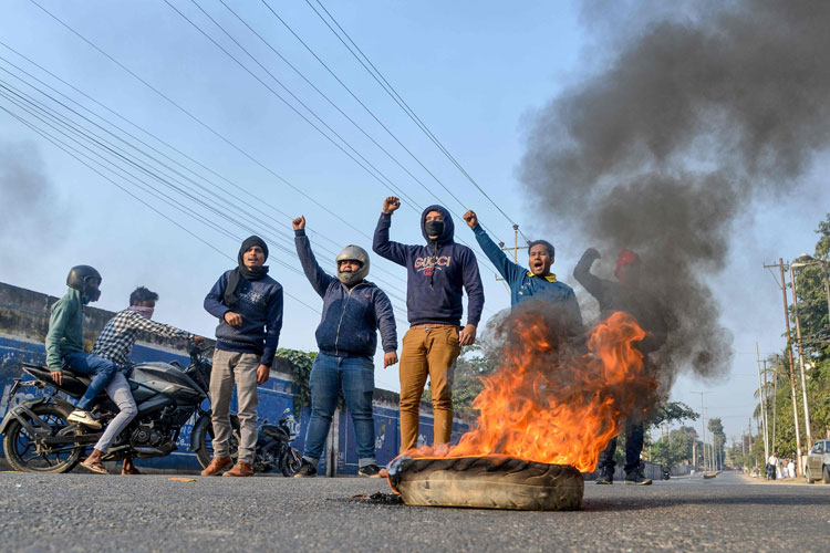 নাগরিকত্ব সংশোধনী বিলের বিরুদ্ধে গুয়াহাটিতে এনইএসও-র সদস্যদের প্রতিবাদ। ছবি: এএফপি।