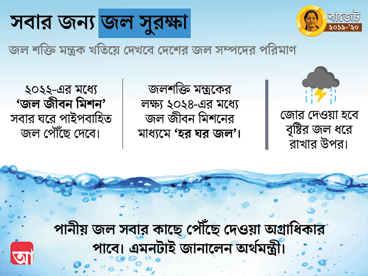 দুই মন্ত্রক মিশে যাওয়ার পরে জল সংক্রান্ত সব বিষয় দেখার জন্য যতটা বরাদ্দ হবে আশা করা হচ্ছিল, তা হয়নি। নির্মলা বরাদ্দ করেছেন মোট ২৮,২৬১ কোটি টাকা। ২০১৭-১৮-তে দুই মন্ত্রকের মোট বরাদ্দের থেকেও এটা ১০০০ কোটি কম। সব ঘরে নলে করে জল পৌঁছে দেওয়ার ঘোষণা হলেও বাস্তবে সরকার এ বিষয়ে কতটা আন্তরিক, উঠেছে সেই প্রশ্ন। উঠছে নমামি গঙ্গে প্রকল্পের কথাও।