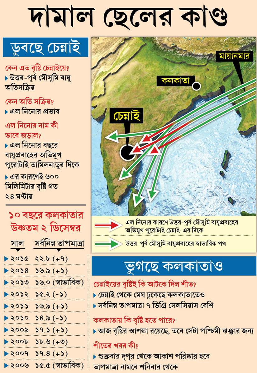 এল নিনো নামক ভিলেনের জন্যই যে এ বার চেন্নাইয়ের এমন অবস্থা, তা মানছেন পুণের কেন্দ্রীয় আবহাওয়া পূর্বাভাস দফতরের অবসরপ্রাপ্ত ডেপুটি ডিরেক্টর জেনারেল অর্ধেন্দুভূষণ মজুমদারও। তাঁর মন্তব্য, ‘‘উত্তর-পূর্ব মৌসুমি বায়ুর গতিপ্রকৃতিকে এল নিনো নিয়ন্ত্রণ করে। সে শক্তিশালী হলে উত্তর-পূর্ব মৌসুমি বায়ুতে বৃষ্টি বেশি হবে। চেন্নাইয়ের ক্ষেত্রে তাই হয়েছে।’’