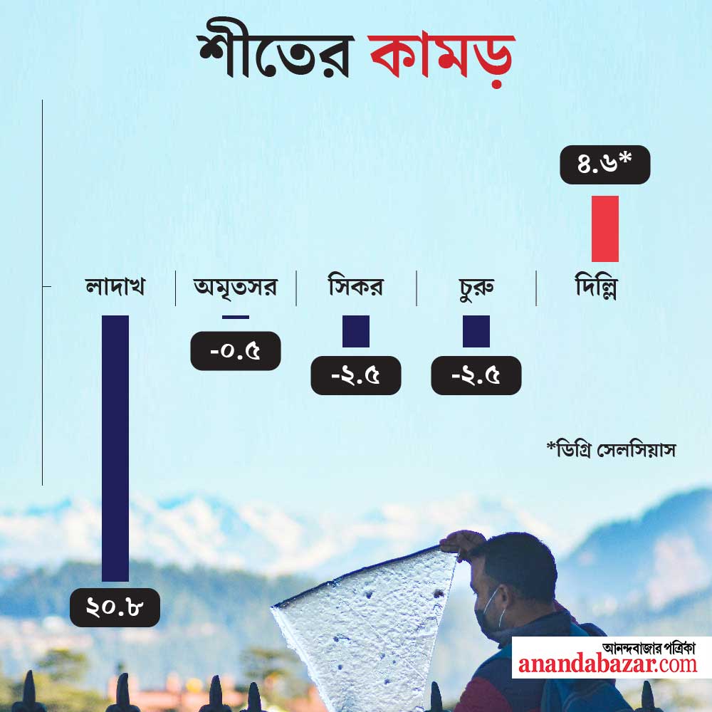 দিল্লিতে রবিবার এই মরসুমের সবচেয়ে শীতলতম দিন ছিল। সর্বনিম্ন তাপমাত্রা ৪.৬ ডিগ্রি সেলসিয়াস। লোধী রোডে সর্বনিম্ন তাপমাত্রা ছিল ৩.৬ ডিগ্রি সেলসিয়াস। রাজস্থানের ফতেপুর এবং চুরুতে তাপমাত্রা হিমাঙ্কের নীচে নেমে গিয়েছে। ফতেপুরে সর্বনিম্ন তাপমাত্রা হিমাঙ্কের ৩.৩ ডিগ্রি সেলসিয়াস নীচে। অন্য দিকে, চুরু এবং সিকরে তাপমাত্রা হিমাঙ্কের ২ ডিগ্রি নীচে নেমে গিয়েছে। অমৃতসরেও তাপমাত্রা হিমাঙ্কের নীচে পৌঁছেছে।