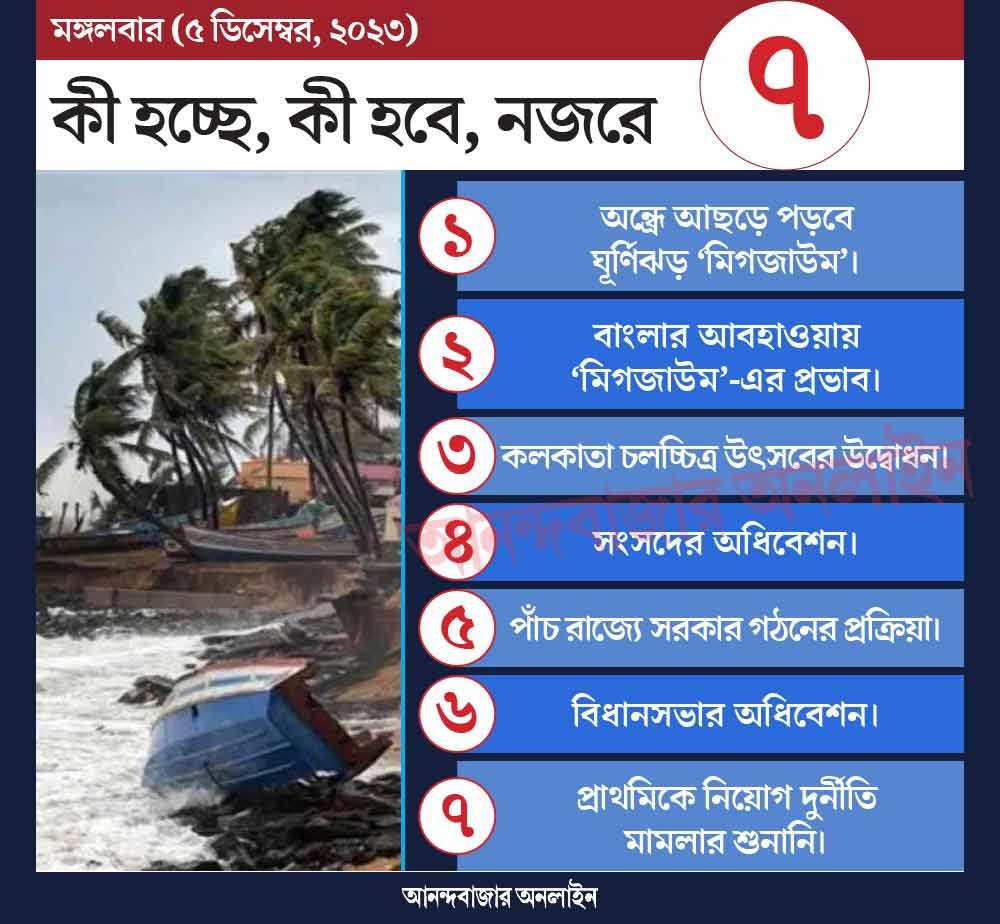 আজ অন্ধ্রপ্রদেশের নেল্লোর এবং মছলিপত্তনমের মাঝখান দিয়ে স্থলভাগে আছড়ে পড়তে পারে ‘মিগজাউম’। তখন তার গতি থাকতে পারে ঘণ্টায় ৯০ থেকে ১০০ কিলোমিটার। তার প্রভাবে ভারী বৃষ্টি হতে পারে তামিলনাড়ুর চেন্নাই-সহ সাত জেলায়। নজর থাকবে এই খবরে।