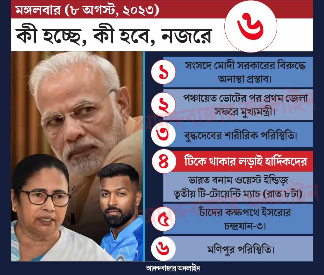ওয়েস্ট ইন্ডিজের বিরুদ্ধে পাঁচ ম্যাচের টি২০ সিরিজ়ে ভারত ০-২ পিছিয়ে। মঙ্গলবার সিরিজ় বাঁচানোর লড়াইয়ে নামবেন হার্দিক পাণ্ড্যেরা। ভারতীয় সময় রাত ৮টা থেকে শুরু খেলা। দেখা যাবে ডিডি স্পোর্টস চ্যানেলে।