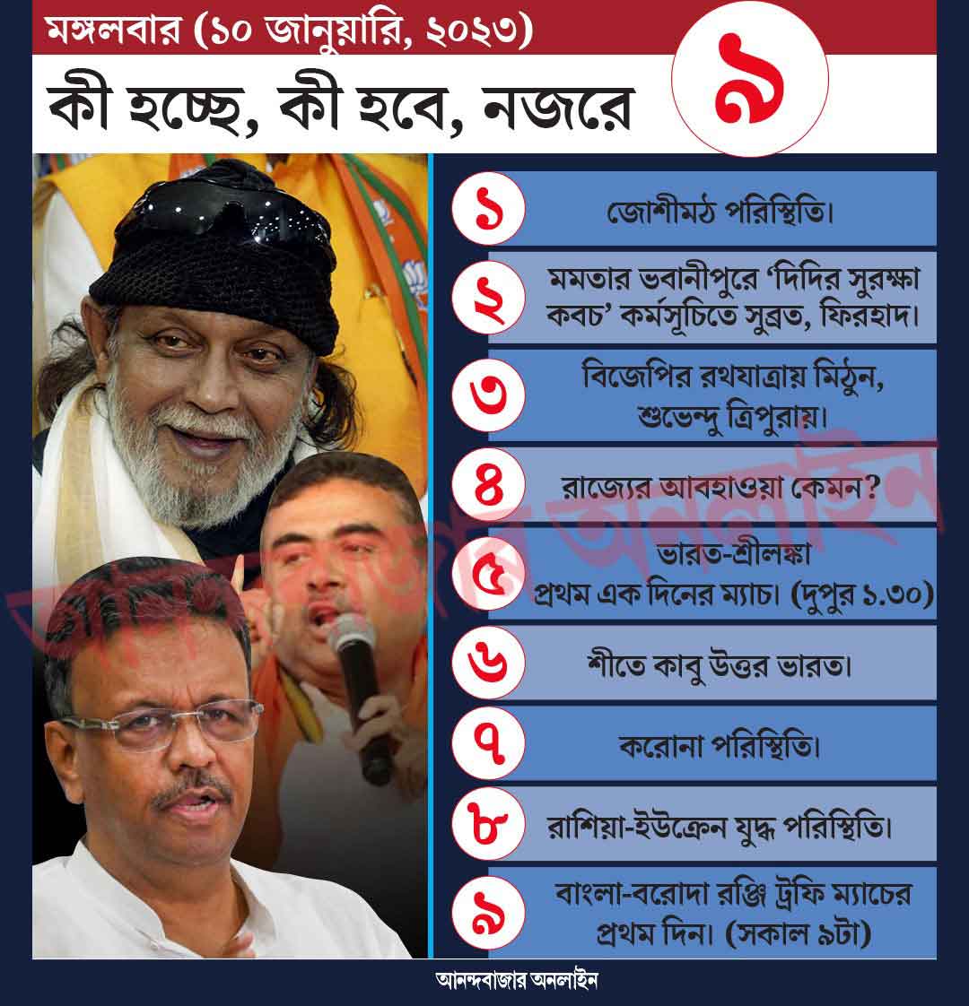 আজ ত্রিপুরা সফরে যাবেন রাজ্যের বিরোধী দলনেতা শুভেন্দু অধিকারী এবং বিজেপি নেতা তথা অভিনেতা মিঠুন চক্রবর্তী। সেখানে তাঁদের একাধিক দলীয় কর্মসূচি রয়েছে। এ ছাড়া সে রাজ্যে বিজেপির রথযাত্রায় অংশ নেবেন মিঠুন। নজর থাকবে এই খবরের দিকে।