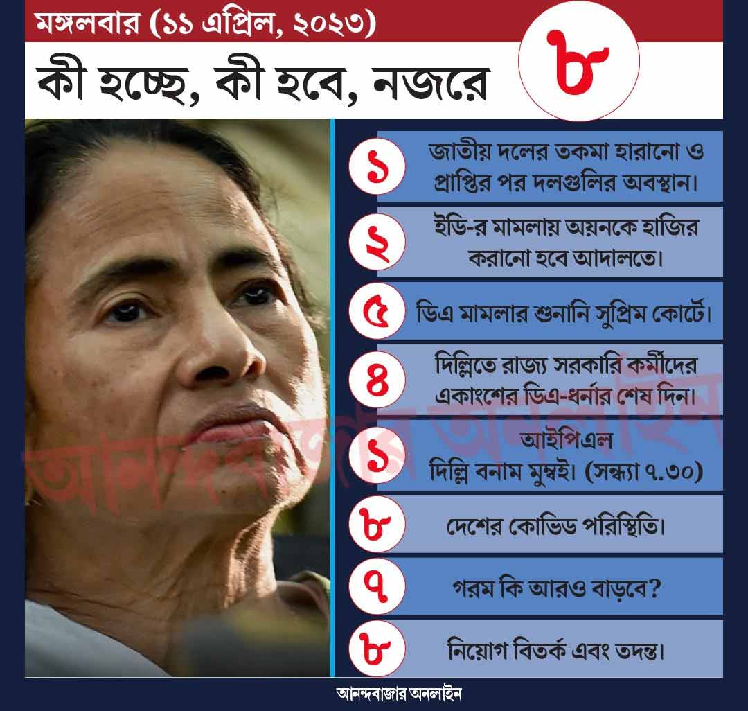 ডিএ-র দাবিতে রাজ্য সরকারি কর্মীদের একাংশ দিল্লিতে ধর্না কর্মসূচি নেয়। আজ ওই কর্মসূচির শেষ দিন। সুপ্রিম কোর্টে তাঁদের মামলাটির কী হয় সে দিকে তার উপর পরবর্তী কর্মসূচি ঘোষণা করবে তারা। আজ নজর থাকবে এই খবরের দিকে।