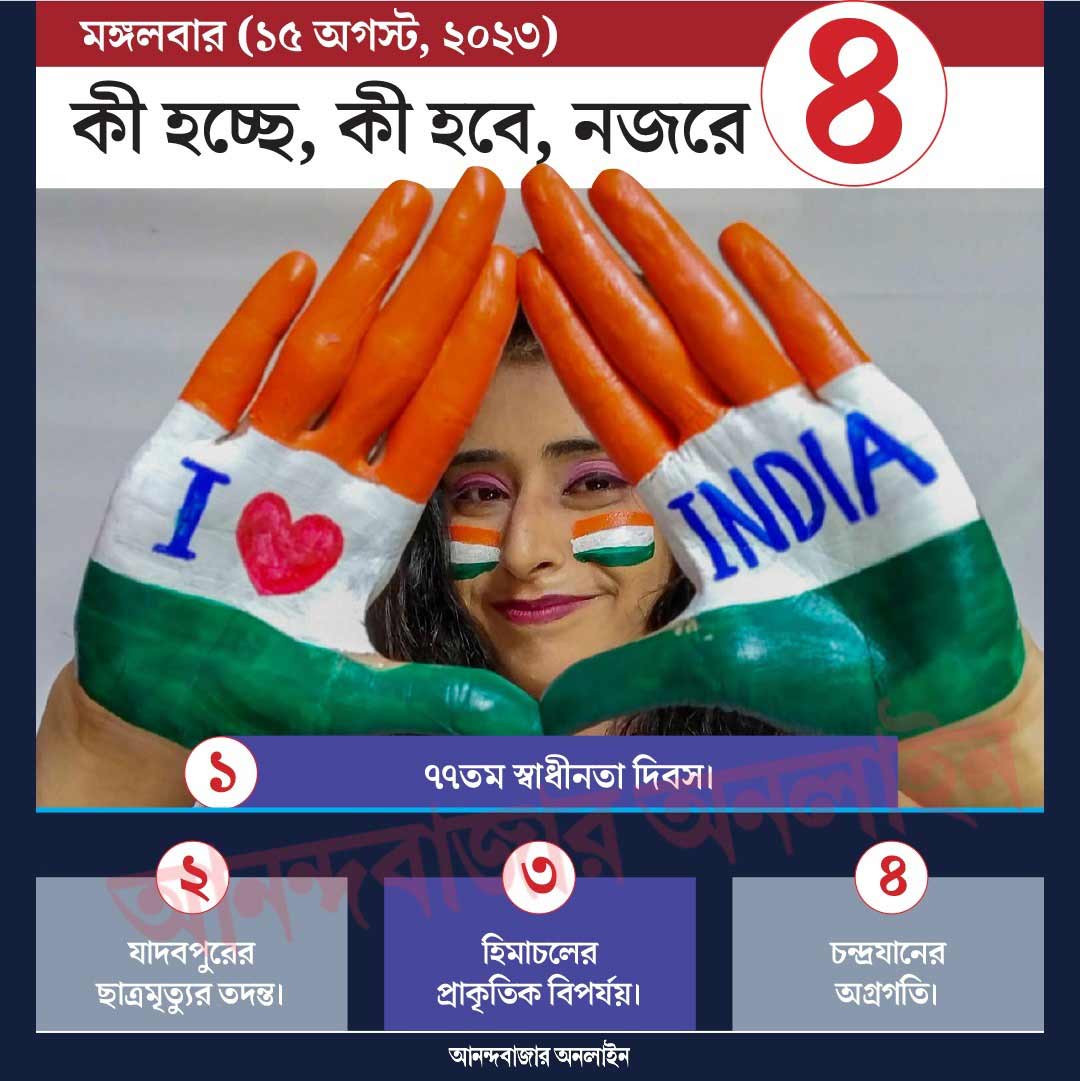 আজ দেশের ৭৭তম স্বাধীনতা দিবস। দেশ জুড়ে সাড়ম্বরে পালিত হবে দিনটি। লালকেল্লায় পতাকা উত্তোলন করে দেশবাসীর উদ্দেশে ভাষণ দেবেন প্রধানমন্ত্রী নরেন্দ্র মোদী। গোষ্ঠীদ্বন্দ্বে দীর্ণ মণিপুরে স্বাধীনতা দিবসে বিদ্রোহী সংগঠনগুলি ধর্মঘটের ডাক দিয়েছে। বাংলার মুখ্যমন্ত্রী মমতা বন্দ্যোপাধ্যায় রেড রোডে জাতীয় পতাকা উত্তোলন করবেন।