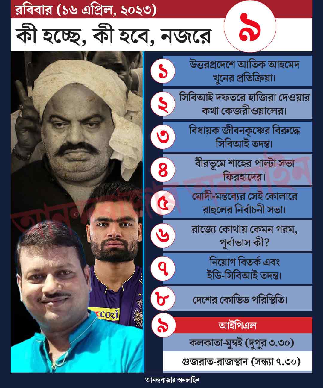 উত্তরপ্রদেশের প্রয়াগরাজে পুলিশের চোখের সামনে আততায়ীদের হাতে খুন হয়ে গেলেন গ্যাংস্টার আতিক আহমেদ এবং তাঁর ভাই আশরফ। আতিক এবং আশরফকে মেডিক্যাল পরীক্ষার জন্য নিয়ে যাচ্ছিল পুলিশ। হাসপাতালে যাওয়ার পথে হাঁটতে হাঁটতে সাংবাদিকদের সঙ্গে কথা বলছিলেন আতিক। সেই সময়ই আচমকা আতিকের মাথা লক্ষ্য করে গুলি করা হয়। আজ, রবিবার নজর থাকবে এই খবরের দিকে।