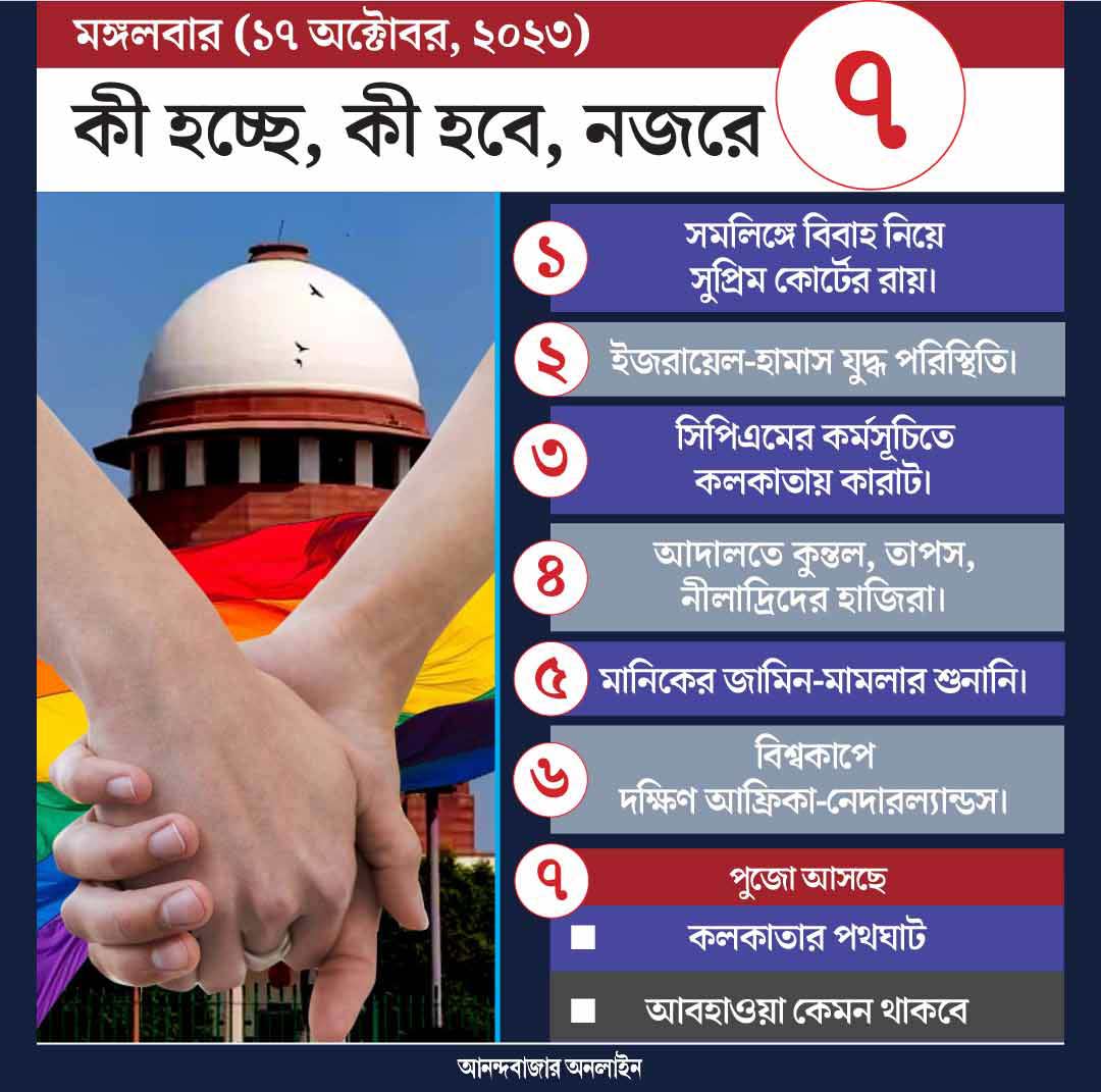 সমলিঙ্গে বিয়ের আইনি স্বীকৃতি সংক্রান্ত একগুচ্ছ আবেদনের মামলায় রায় আজ ঘোষণা করতে পারে সুপ্রিম কোর্ট। মোদী সরকারের বক্তব্য— ‘সমলিঙ্গে বিয়ের আইনি বৈধতা নিয়ে সুপ্রিম কোর্টের সাংবিধানিক বেঞ্চের কোনও রায় সঠিক পদক্ষেপ হবে না’! প্রধান বিচারপতি চন্দ্রচূড় গোড়া থেকেই কেন্দ্রের সঙ্গে দ্বিমত পোষণ করেছেন। কখনও বলেছেন, ‘‘সমকামিতা যে কেবল শহুরে বিষয়, এমন কোনও পরিসংখ্যান নেই সরকারের কাছে।’’ কখনও বলেছেন, ‘‘সমকামী সম্পর্কগুলি কেবল শারীরিক নয়, মানসিক, স্থিতিশীল সম্পর্কও।’’ এই অবস্থায় শীর্ষ আদালত কী রায় দেয় সে দিকে নজর থাকেব।