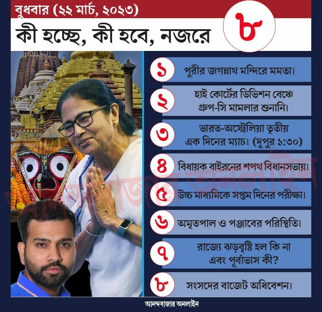 ওড়িশা সফরে রয়েছেন পশ্চিমবঙ্গের মুখ্যমন্ত্রী মমতা বন্দ্যোপাধ্যায়। সফরের দ্বিতীয় দিনে আজ, বুধবার তিনি পুরীর জগন্নাথ মন্দিরে যাবেন। নজর থাকবে এই খবরের দিকে।