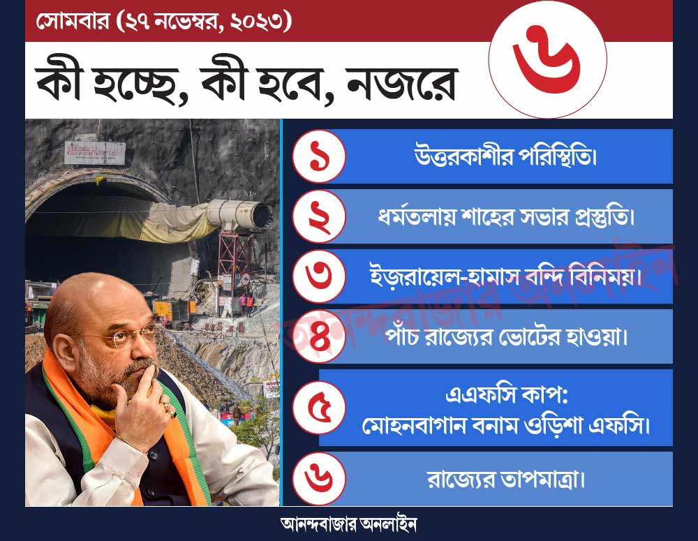 উত্তরকাশীতে জারি রয়েছে উদ্ধারকাজ। সিল্কিয়ারা সুড়ঙ্গে আটকে থাকা ৪১ জন শ্রমিককে বার করার জন্য ছ’রকম পরিকল্পনা করা হয়েছে। ইতিমধ্যেই উপর দিক থেকে থেকে গর্ত খুঁড়ে সুড়ঙ্গে প্রবেশের চেষ্টা শুরু করেছে একটি দল। অন্য এক দল কাজ করছে সুড়ঙ্গের মূল প্রবেশপথে। সেখানে ধস সরানোর কাজ করতে গিয়ে আটকে গিয়েছিল আমেরিকায় তৈরি অগার মেশিন। ভারতীয় সেনাবাহিনীর একটি দল সেই মেশিনকে সেখান থেকে সরিয়ে হাতে করে ধস সরানোর কাজ করবে। এই পরিস্থিতির মধ্যেই সোম এবং মঙ্গলবার উত্তরকাশীতে বৃষ্টি এবং তুষারপাতের পূর্বাভাস দিয়েছে মৌসম ভবন। প্রতিকূল পরিস্থিতিতে উদ্ধারকাজ কতদূর এগোয়, সে দিকে নজর থাকবে।