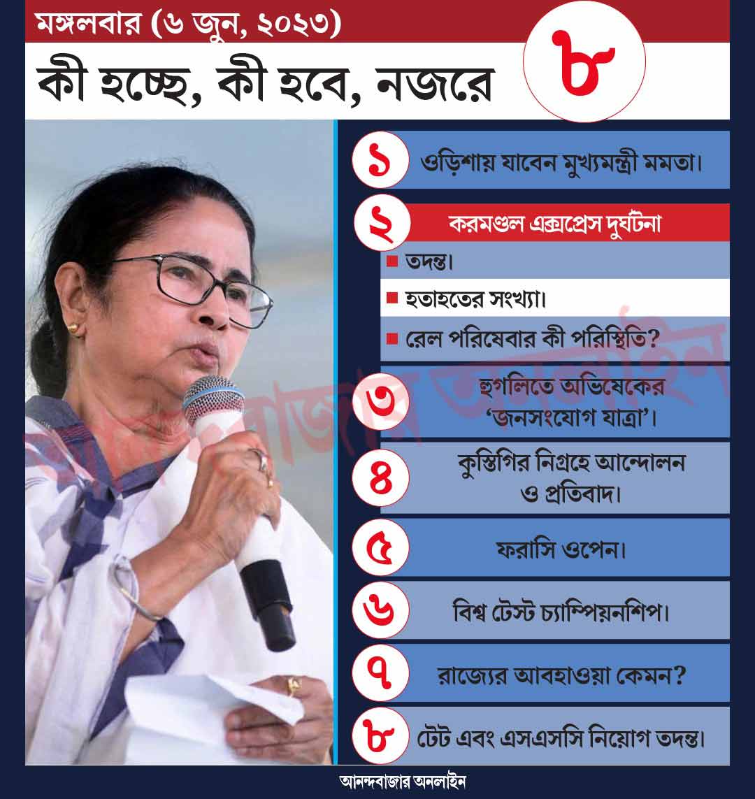 আজ, মঙ্গলবার করমণ্ডল এক্সপ্রেস দুর্ঘটনায় আহতদের দেখতে আবার ওড়িশায় যাবেন মুখ্যমন্ত্রী মমতা বন্দ্যোপাধ্যায়। কটক এবং ভুবনেশ্বর, দু’জায়গাতেই হাসপাতালে ভর্তি আহত রোগীদের দেখতে যাবেন তিনি। আজ নজর থাকবে এই খবরের দিকে।