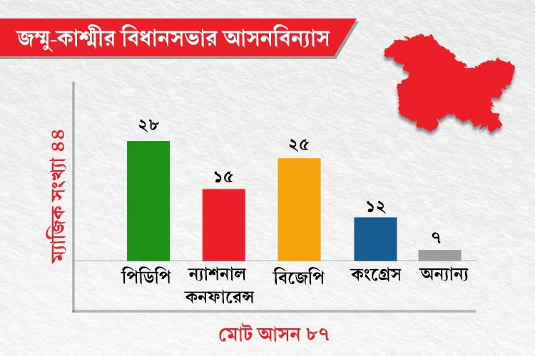 জম্মু-কাশ্মীর বিধানসভায় মোট ৮৭টি আসন। ২০১৪-র মে মাসে উপত্যকায় যে নির্বাচন হয়, সেখানে পিডিপি পেয়েছিল ২৮টি আসন। বিজেপি পেয়েছিল ২৫টি। এ ছাড়া ওমর আবদুল্লার দল ন্যাশনাল কনফারেন্স ১৫টি, কংগ্রেস ১২টি এবং অন্যান্যরা ৭টি আসন পেয়েছিল। বিজেপি এবং পিডিপি যৌথ ভাবে ম্যাজিক সংখ্যা ৪৪ ছাড়িয়ে ৫৩-য় পৌঁছয়। সেই জোটই এত দিন সরকার চালাচ্ছিল উপত্যকায়।