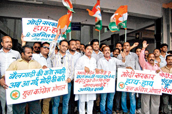 রেল বাজেট নিয়ে ভোপালেও শুরু হয় কংগ্রেস সমর্থকদের বিক্ষোভ। মঙ্গলবার। ছবি: পি টি আই।