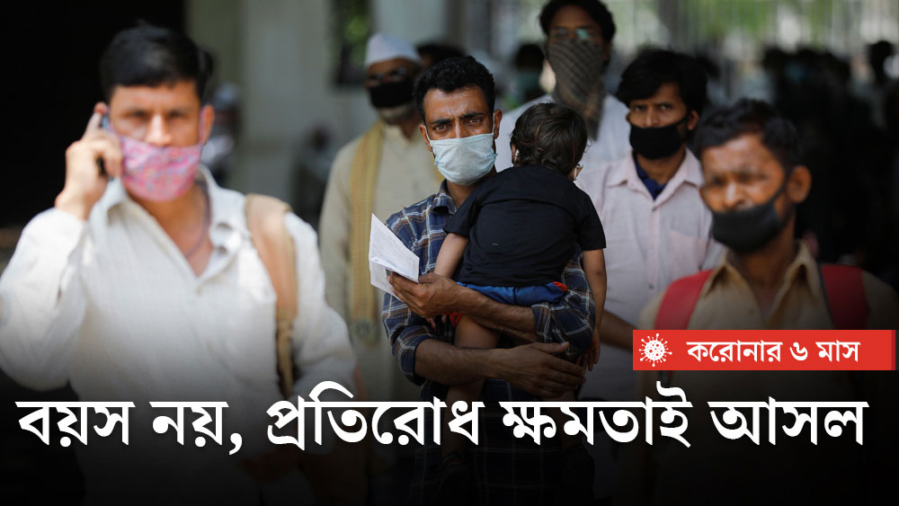 কোভিডে আক্রান্ত এবং মৃতদের মধ্যে প্রবীণদের অংশ বিশাল এতে সন্দেহ নেই। এশিয়ার বিভিন্ন দেশে স্বাস্থ্য সংক্রান্ত গবেষণাকারী সংস্থা ‘হেল্থ অ্যানালিটিকস এশিয়া’র একটি রিপোর্ট অনু্যায়ী ভারতে মৃতদের মধ্যে ৬৩ শতাংশই ৬০ বছরের বেশি বয়সী। এপ্রিল মাসে কেন্দ্রীয় স্বাস্থ্যমন্ত্রক থেকে পাওয়া তথ্যের উপর ওই সমীক্ষা করা হলেও এখনও সেই চিত্রটা খুব একটা পাল্টায়নি। ইউরোপ-আমেরিকার করোনাচিত্রে সামান্য হেরফের হলেও মোটের উপর ছবিটা একই প্রকৃতির। ইউরোপে ‘বুড়োরা মরছে আমাদের কী’— এই জাতীয় মনোভাব প্রথম দিকে তরুণ প্রজন্মের একটা অংশের মধ্যে দেখা গিয়েছিল। কিন্তু করোনার বয়স যত বেড়েছে সেই ধারণা ভ্রান্ত প্রমাণিত হয়েছে। ভারতের পাশাপাশি সারা বিশ্বেই করোনা আক্রান্তদের একটা বড় অংশের বয়স ২০ থেকে ৬০ বছরের মধ্যে। ফলে বয়সের তত্ত্ব ছেড়ে উঠে এসেছে ‘ইমিউনিটি’ বা ‘রোগ প্রতিরোধ ক্ষমতা’র তত্ত্ব। অর্থাৎ, শরীরে রোগ প্রতিরোধ ক্ষমতা যত বেশি থাকবে, করোনা থেকে তিনি তত বেশি ভয়মুক্ত। যেহেতু এই ভাইরাস ফুসফুসে আক্রমণ করে, তাই ফুসফুস সংক্রান্ত জটিলতা থাকলে ঝুঁকি বেশি। অধিকাংশ ক্ষেত্রে হয়ে উঠছে প্রাণঘাতী।