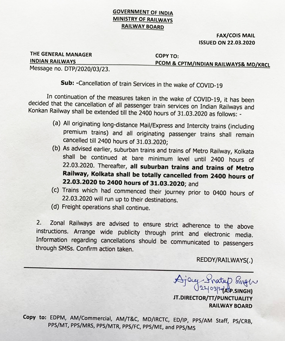 রেলের ওই বিজ্ঞপ্তিতে বলা হয়েছে, ‘‘করোনাভাইরাসের সংক্রমণ ব্যাপক আকারে ছড়িয়ে পড়ায় সমস্ত মেল, এক্সপ্রেস ও প্যাসেঞ্জার ট্রেন বাতিল করা হল। তবে কলকাতা ও শহরতলিতে এখনও লোকাল ট্রেন চলছে। পাশাপাশি কলকাতা মেট্রো ও ইস্ট-ওয়েস্ট মেট্রোও চলছে। আজ মধ্যরাত পর্যন্ত চলার পর সেগুলিও বন্ধ করে দেওয়া হবে। পরিষেবা বন্ধ থাকবে আগামী ৩১ মার্চ মধ্যরাত পর্যন্ত।’’