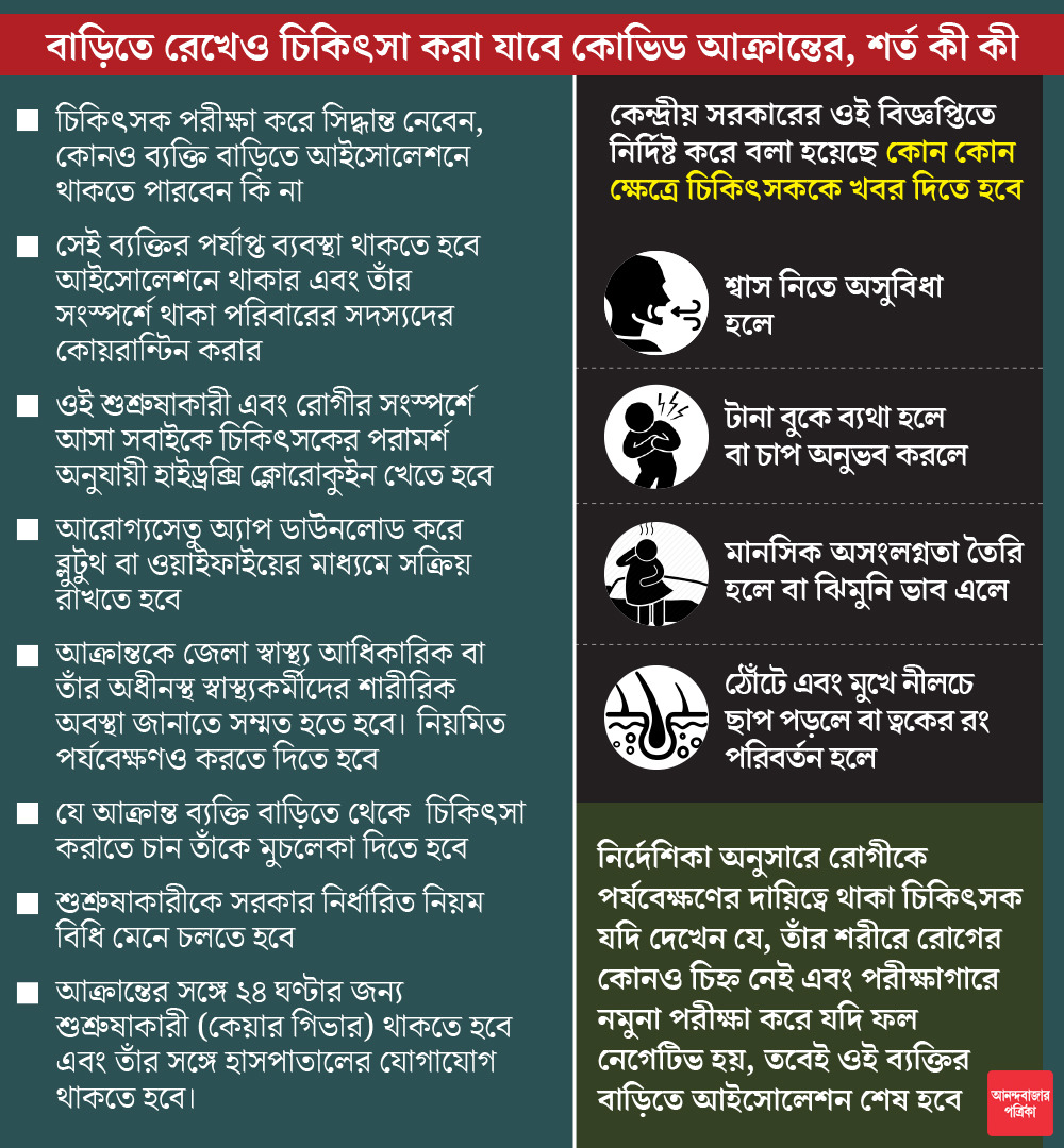 ওই নির্দেশিকায় বলা হয়েছে, চিকিৎসক যদি মনে করেন যে রোগীর সংক্রমণের মাত্রা কম অথবা করোনার উপসর্গ রয়েছে, সে ক্ষেত্রে তাঁর পরামর্শ মতো কোনও ব্যক্তি বাড়িতে প্রয়োজনীয় নিয়ম মেনে আইসোলেশনে থাকতে পারেন। সোমবারই মুখ্যমন্ত্রী মমতা বন্দ্যোপাধ্যায় ঘোষণা করেছিলেন করোনা আক্রাম্তের সংস্পর্শে থাকা ব্যক্তিরা বাড়িতে আইসোলেশনে থাকতে পারবেন। সরকারি কোয়রান্টিন সেন্টারে যাওয়ার প্রয়োজন নেই। তবে রাজ্যের নির্দেশিকায় বলা হয়েছিল, কোভিড আক্রাম্ত হলে অবশ্যই হাসপাতালে ভর্তি হতে হবে। এ দিন কেন্দ্রীয় স্বাস্থ্য মন্ত্রক আরও এক ধাপ এগিয়ে স্বল্প মাত্রার সংক্রমিত কোভিড রোগীকেও বাড়িতে থাকার অনুমতি দিল। পরে রাজ্য সরকারও একই মর্মে বিবৃতি জারি করে।