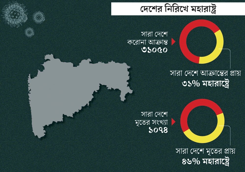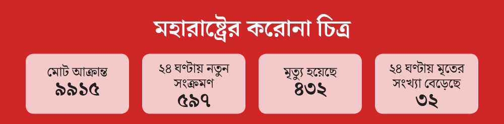 মহারাষ্ট্রের সংক্রমণের চিত্রটা বুঝতে শুধু এই পরিসংখ্যানই যথেষ্ট নয়। সারা দেশে কোভিড আক্রান্তের মধ্যে ৩১ শতাংশেরও বেশি আক্রান্ত এই রাজ্যেই। মৃত্যুর হিসাবটা আরও ভয়ঙ্কর। সারা দেশের ৪৬ শতাংশেরও বেশি মানুষের মৃত্যু হয়েছে মহারাষ্ট্রেই। আবার সারা দেশে প্রতিদিন যত সংখ্যক মানুষ নতুন করে আক্রান্ত হচ্ছেন, তার প্রায় এক তৃতীয়াংশই মহারাষ্ট্রের।