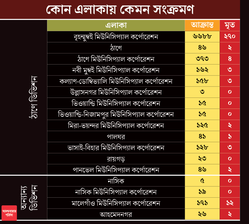মহারাষ্ট্রে আক্রান্তের অধিকাংশই মুম্বই এবং সংলগ্ন এলাকায়। তার মধ্যেও আবার শুধু বৃহন্মুম্বই মিউনিসিপ্যাল কর্পোরেশন এলাকাতেই আক্রান্তের সংখ্যা ৬৬৪৪। অর্থাৎ মুম্বই শহরাঞ্চলেই আক্রান্তের মোট আক্রান্তের প্রায় দুই তৃতীয়ংশ। রাজ্যে সংক্রমণ ছড়িয়েছে মূলত ঠাণে ডিভিশনে। বৃহন্মুম্বই ছাড়াও এর মধ্যে রয়েছে ঠাণে, ঠাণে পুরসভা, নবি মুম্বই পুরসভা, কল্যাণ-ডোম্বিভ্যালি পুরসভার মতো এলাকা। সব মিলিয়ে ঠাণে ডিভিশনেই সিংহভাগ আক্রান্ত মৃত।