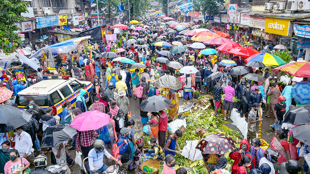 দূরত্ব-বিধি উড়িয়ে ভিড় বাজারে। শুক্রবার মুম্বইয়ের দাদরে। ছবি: পিটিআই।