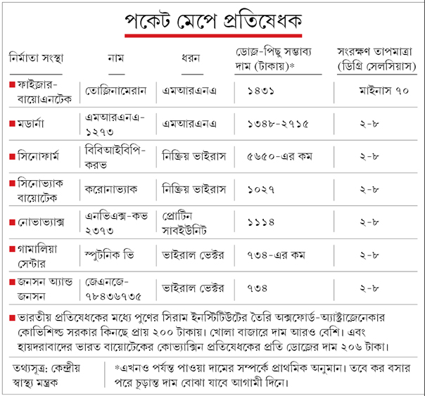 ভারতের দু’টি-সহ বিভিন্ন দেশ মিলিয়ে এই মুহূর্তে প্রায় গোটা দশেক প্রতিষেধক জরুরি ভিত্তিতে ব্যবহারের অনুমতি পেয়েছে। আজ কেন্দ্রীয় স্বাস্থ্যসচিব রাজেশ ভূষণ দেশীয় প্রতিষেধকের সঙ্গে বিদেশি প্রতিষেধকের দামের তুলনা করে বলেন, ‘‘ফাইজার প্রতিষেধকের ভারতীয় মূল্য প্রায় ১৪৩১ টাকা। মডার্নার দাম পড়ছে ২৩৪৮-২১৭৫ টাকার কাছাকাছি। রাশিয়ার স্পুটনিক ভি এবং জনসন ও জনসন প্রতিষেধকের দাম ৭৩৪ টাকার কাছাকাছি। নোভাভ্যাক্স প্রতিষেধকের দাম পড়ছে ১১১৪ টাকা।’’ স্বাস্থ্যসচিবের দাবি, ‘‘এর সঙ্গে যোগ হবে বিদেশ থেকে ওই প্রতিষেধক আমদানি করার খরচ। দেশীয় প্রতিষেধকের দাম কম পড়বে, ধরে নিয়েই গোড়া থেকেই তা তৈরিতে জোর দিয়েছিল সরকার।’’ সরকারের দাবি, তা না হলে বিপুল পরিমাণে বিদেশি মুদ্রা কেবল প্রতিষেধক কিনতেই রাজকোষ থেকে খরচ হত। ফলে আরও তলানিতে নেমে যাওয়ার সম্ভাবনা ছিল দেশের অর্থনীতির।
