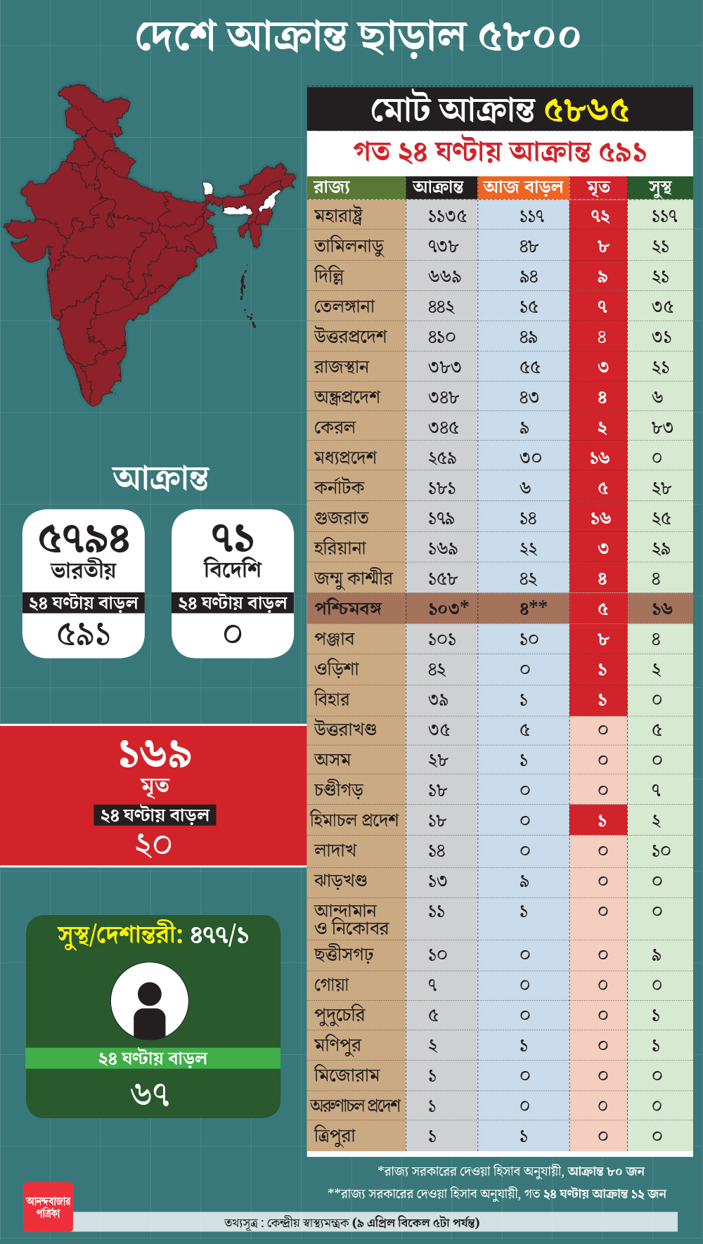 সবমিলিয়ে এই মুহূর্এতে দেশে করোনা আক্রান্তের সংখ্যা ৬ হাজার ছুঁইছুঁই। বৃহস্পতিবার বিকাল ৫টা পর্যন্ত আরও নতুন করে ৫৯১ জন কোভিড-১৯ ভাইরাসে আক্রান্ত হওয়ায় দেশে মোট আক্রান্তের সংখ্যা দাঁড়িয়েছে ৫ হাজার ৮৬৫। গত ২৪ ঘণ্টায় ২০ জন প্রাণও হারিয়েছেন। তাতে দেশে করোনায় আক্রান্ত হয়ে মৃত্যুসংখ্যা এসে ঠেকেছে ১৬৯-এ। কেন্দ্রীয় সরকারের পরিসংখ্যান অনুয়ায়ী বাংলায় এখনও পর্যন্ত ১০৩ জন করোনায় আক্রান্ত হয়েছেন। যদিও রাজ্য সরকারের হিসাবে সংখ্যাটা ৮৩।