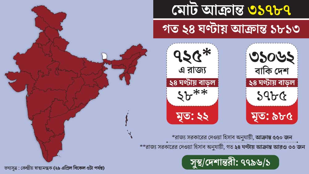 দ্বিতীয় দফার লডকাউনে মেয়াদ শেষ হচ্ছে ৩ মে। সংক্রমণের নিরিখে গোটা দেশকে তিন ভাগে ভাগ করে অর্থনীতির চাকা গড়ানোর পরিকল্পনাও নেওয়া হচ্ছে। এর মাঝেই দেশে করোনাভাইরাসে আক্রান্তের সংখ্যা বেড়ে প্রায় ৩২ হাজার ছুঁইছুঁই। বুধবার বিকেলে কেন্দ্রীয় স্বাস্থ্যমন্ত্রকের দেওয়া হিসেবে গত ২৪ ঘণ্টায় নতুন করে কোরনাভাইরাসের সংক্রমণ হয়েছে ১৮১৩ জনের। এই নিয়ে দেশে মোট করোনা আক্রান্তের সংখ্যা ৩১৭৮৭। তবে বুধবার ফের সংক্রমণ বৃদ্ধির হার কিছুটা বাড়ায় উদ্বেগ বেড়েছে।
