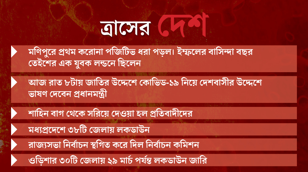 • মণিপুরে প্রথম করোনা পজিটিভ ধরা পড়ল। ইম্ফলের বাসিন্দা বছর তেইশের তরুণী লন্ডনে ছিলেন।