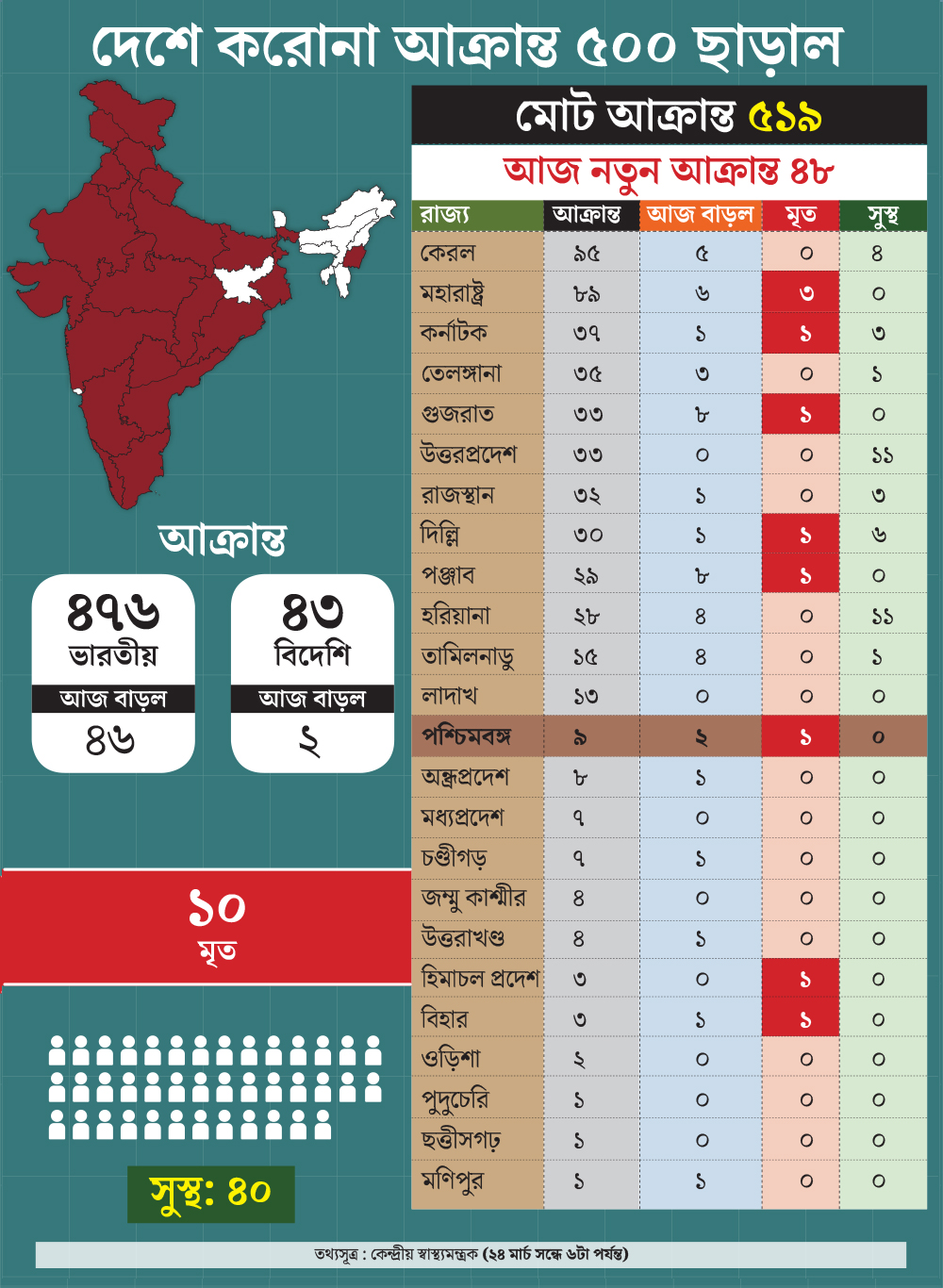 সংক্রমণ ঠেকাতে ইতিমধ্যেই দেশ জুড়ে ৩০টি রাজ্য ও কেন্দ্রশাসিত অঞ্চলের ৫৪৮টি জেলায় লকডাউন চালু করা হয়েছে। প্রতি দিন বিভিন্ন রাজ্যে নতুন করে আক্রান্তের সংখ্যা বাড়ছে। এ দিন মহারাষ্ট্রে আরও ৪ জন নতুন করে আক্রান্ত হয়েছেন বলে সে রাজ্যে স্বাস্থ্য দফতর সূত্রে জানানো হয়েছে। ওই চার জনের মধ্যে ৩ জন পুণের এক জন সাতারার। কেন্দ্রীয় স্বাস্থ্য মন্ত্রকের রিপোর্ট বলছে, এই মুহূর্তে সংক্রমণের সংখ্যায় দেশের মধ্যে শীর্ষে রয়েছে কেরল। এই রাজ্যে এখনও পর্যন্ত আক্রান্ত হয়েছেন ৯৫ জন। তার পরেই রয়েছে মহারাষ্ট্র। সেখানে আক্রান্তের সংখ্যা ৮৭। তার পরে কর্নাটক, উত্তরপ্রদেশ, দিল্লি, রাজস্থান, গুজরাত-সহ আরও রাজ্য।