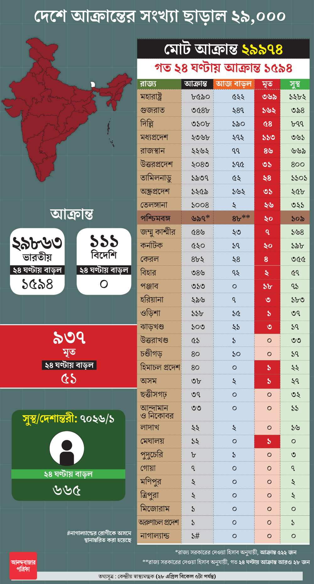 প্রথম থেকেই মহারাষ্ট্রে আক্রান্তের সংখ্যাটা লাফিয়ে লাফিয়ে বাড়ছে। সেখানে ৮ হাজার ৫৯০ জন আক্রান্ত। মৃত্যু হয়েছে ৩৬৯ জনের। আক্রান্তের সংখ্যার বিচারে মহারাষ্ট্রের ধারে কাছে অন্য কোনও রাজ্য নেই। তবে সংক্রমিত দু-তিন হাজার ছাড়িয়ে গিয়েছে অনেক রাজ্যেই। গুজরাতে আক্রান্ত ৩ হাজার ৫৪৮ জন। সেখানে মৃত্যু হয়েছে ১৬২ জনের।দিল্লিতে সংক্রমিত হয়েছেন ৩ হাজার ১০৮ জন। মারা গিয়েছেন ৫৪ জন। মধ্যপ্রদেশে ২ হাজার ৩৬৮ জন করোনায় আক্রান্ত। মৃত্যু হয়েছে ১১৩ জনের। উত্তরপ্রদেশে আক্রান্তের সংখ্যা ২ হাজার ৪৩ জন। অন্ধ্রপ্রদেশে ১ হাজার ২৫৯ জন সংক্রমিত হয়েছেন। সারা দেশে এখনও পর্যন্ত ৭ হাজার ২৭ জন সুস্থ হয়ে উঠেছেন।