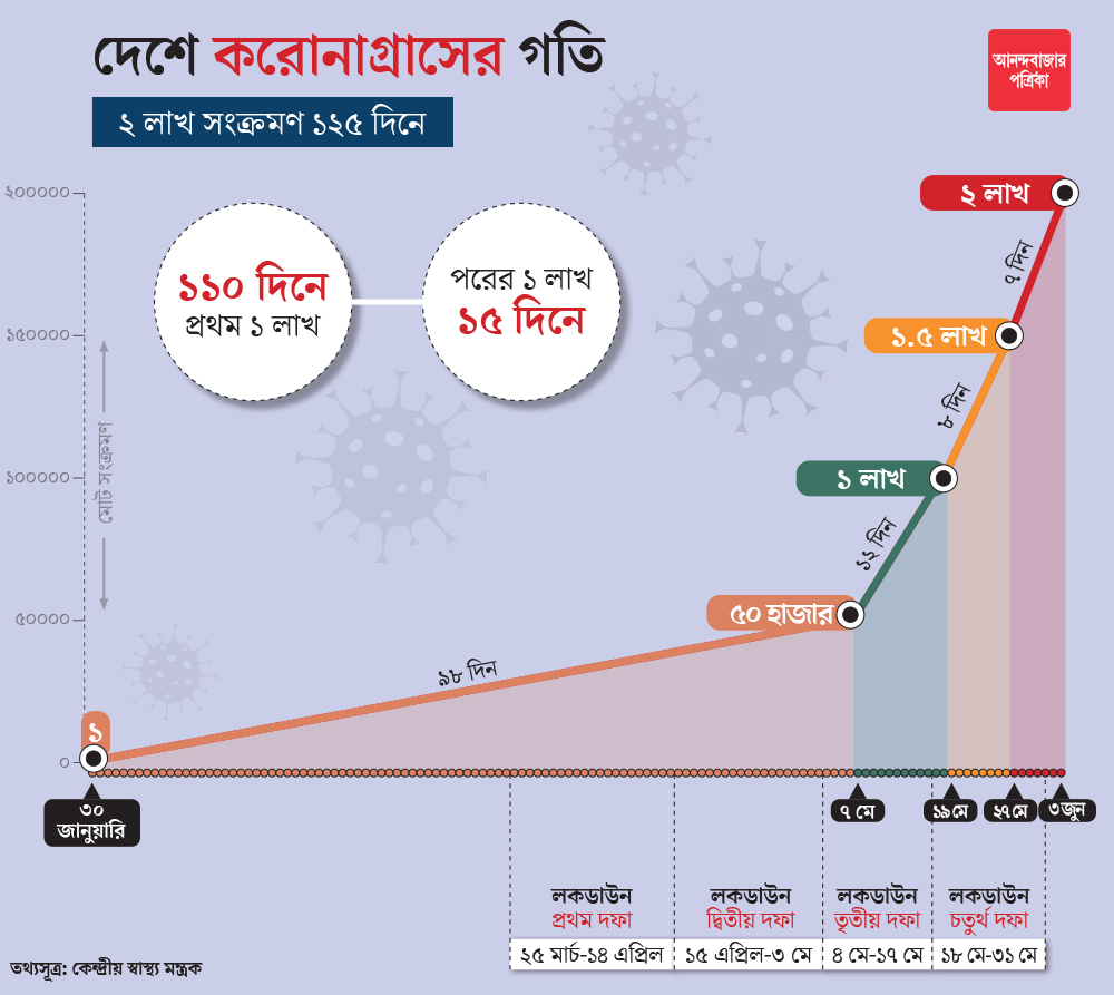 করোনাভাইরাসের গ্রাস থেকে মানুষজনকে বাঁচাতে লকডাউনের দাওয়াই দিয়েছিল কেন্দ্রীয় সরকার। গত ২৪ মার্চ প্রধানমন্ত্রী নরেন্দ্র মোদী ঘোষণা করেন, ২১ দিনের জন্য চলবে লকডাউন। এর পর বার বার লকডাউনের সময়সীমা বাড়ালেও দেশে কোভিড-আক্রান্তের সংখ্যা রাশ তো টানা যায়ইনি। উল্টে তার গ্রাফ ক্রমশই ঊর্ধ্বমুখী হয়েছে। দেশের অর্থনৈতিক ক্ষেত্রগুলিকে চাঙ্গা করতে লকডাউন শিথিল করার সিদ্ধান্তের ফলে করোনা-আক্রান্তের সংখ্যায় আরও কতটা বৃদ্ধি ঘটবে, তা নিয়েও চিন্তিত কেন্দ্র ও রাজ্য— দুই সরকার। এ নিয়ে পঞ্চম দফার লকডাউন বা ‘আনলক ১’ চলাকালীন বেশ কিছু নির্দেশিকাও জারি করেছে কেন্দ্রীয় সরকার।