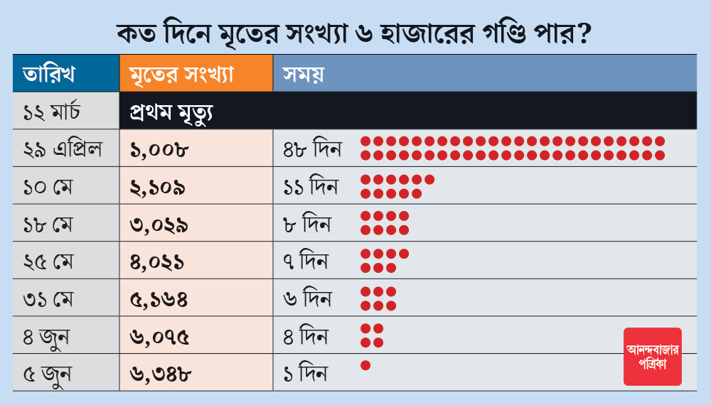 দেশে হু হু করে বাড়ছে করোনাভাইরাসের শিকার। সরকারি স্তরে করোনা-আক্রান্তের তথ্য সংগ্রহ করার প্রায় ৪৮ দিনের মধ্যেই এ দেশে প্রথম হাজার সংক্রমিতের মৃত্যু হয়। তবে সেই সংখ্যক আক্রান্তেরই মৃত্যু হয়েছে প্রায় চার দিনে। মাত্র কয়েক দিনের মধ্যেই করোনায় মৃতের সংখ্যার পার করেছে ৬ হাজার। সেই সঙ্গে মাত্র চার দিনেই মৃত্যু হয়েছে ৯০০ সংক্রমিতের।