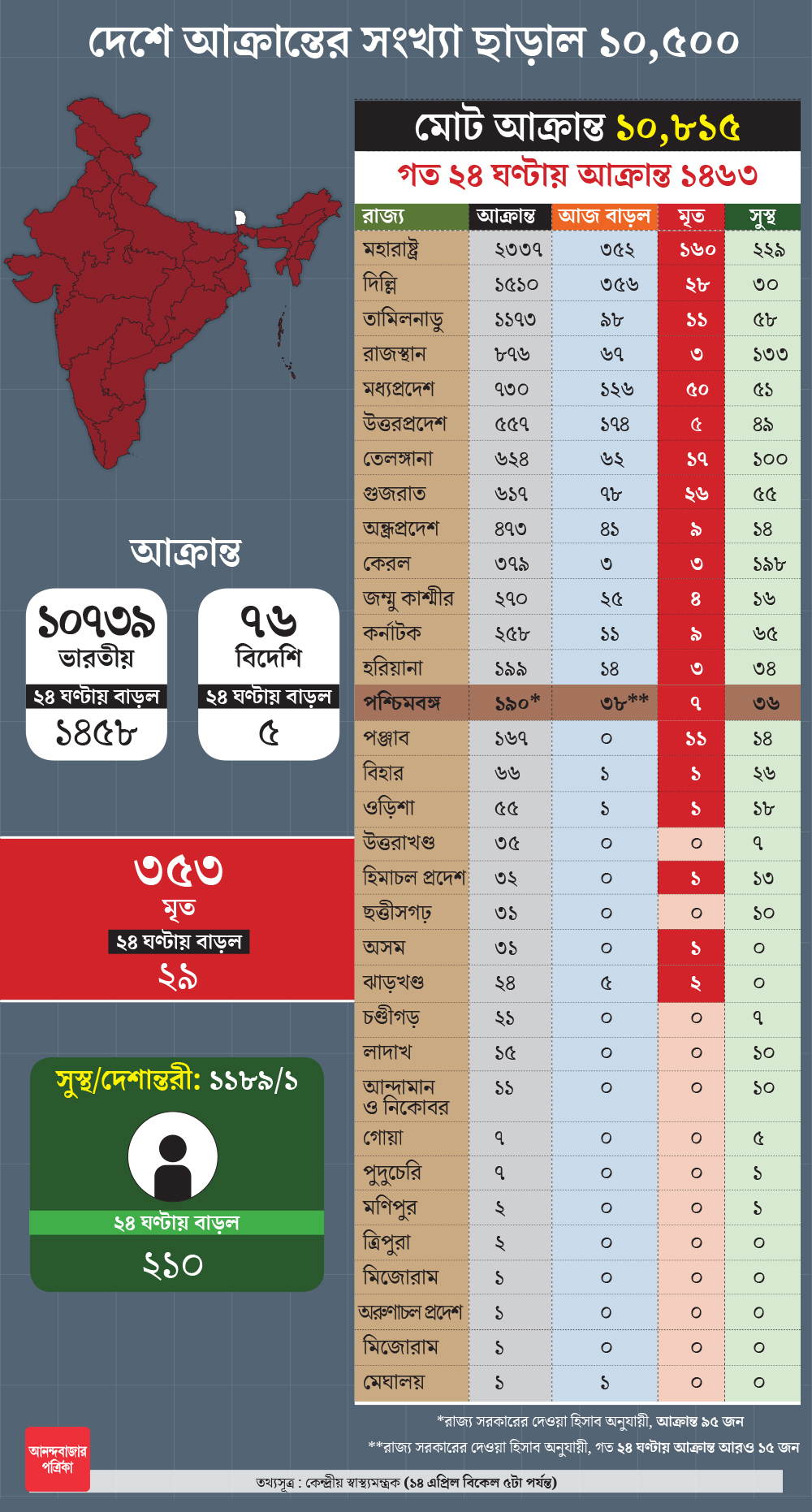 লকডাউন ঘোষণার তিন সপ্তাহের মাথায় দেশে করোনা আক্রান্তের সংখ্যা ১০ হাজারের গণ্ডি ছাড়িয়ে গেল। গত ২৪ ঘণ্টায় ১৪৬৩ জনের করোনা সংক্রমণ ধরা পড়েছে যা এখনও পর্যন্ত রেকর্ড। মোট আক্রান্ত ১০ হাজার ৮১৫ জন বলে জানিয়েছে কেন্দ্রীয় স্বাস্থ্য মন্ত্রক। গত ২৪ ঘণ্টায় দেশ জুড়ে মৃত্যু হয়েছে ২৯ জনের। মৃতের সংখ্যা বেড়ে হয়েছে ৩৪৬।
