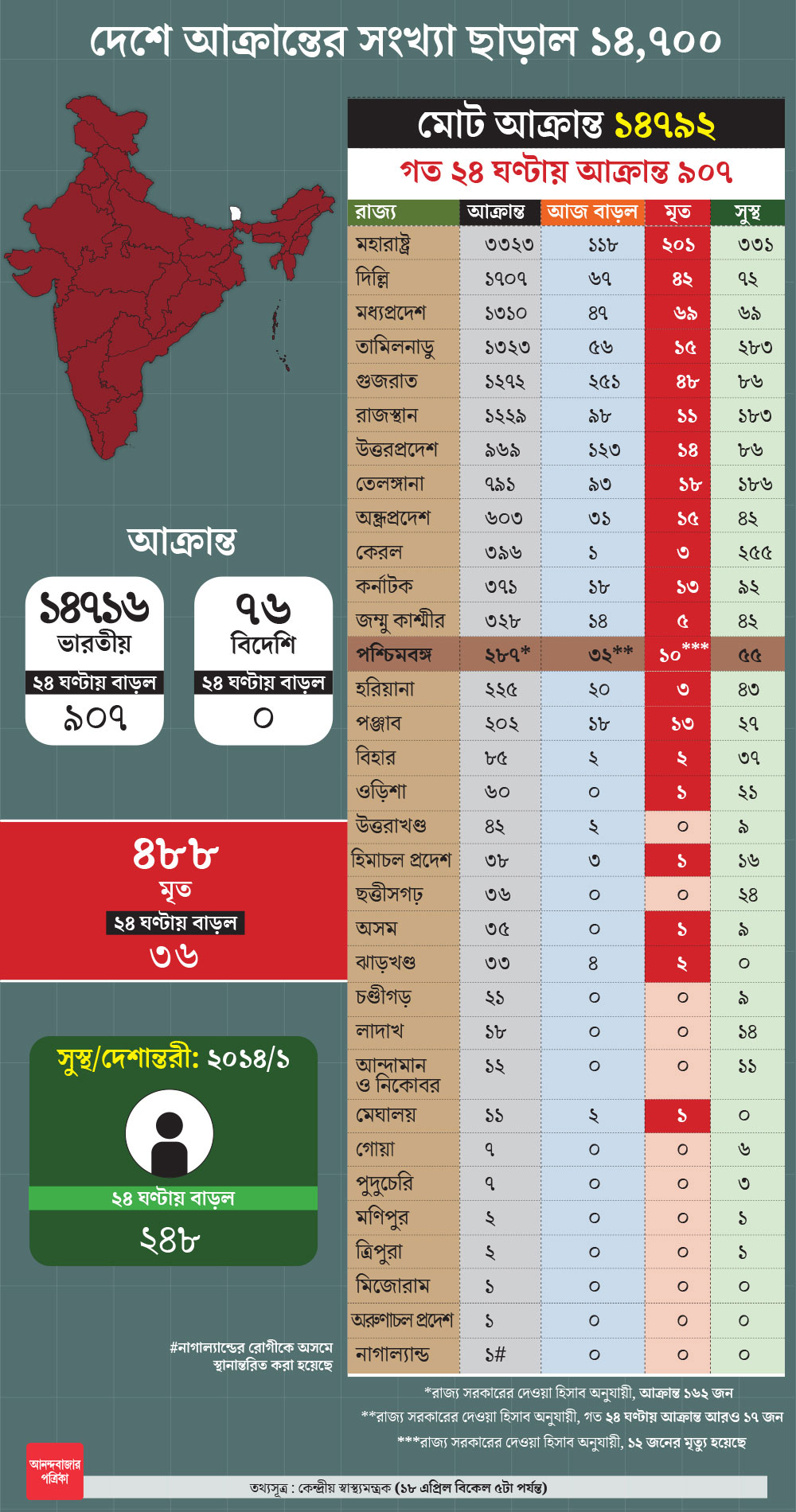 দেশে মেয়াদ বেড়েছে লকডাউনের। কিন্তু এর মধ্যেও রোজই বাড়ছে করোনা আক্রান্তের সংখ্যা। গত ২৪ ঘণ্টায় আরও ৯০৭ জনের করোনা সংক্রমণের খবর মিলেছে। ফলে সারা দেশে এখন আক্রান্তের সংখ্যা ১৫ হাজার ছুঁই ছুঁই। এখন আক্রান্তের সংখ্যা বেড়ে হয়েছে ১৪ হাজার ৭৯২।