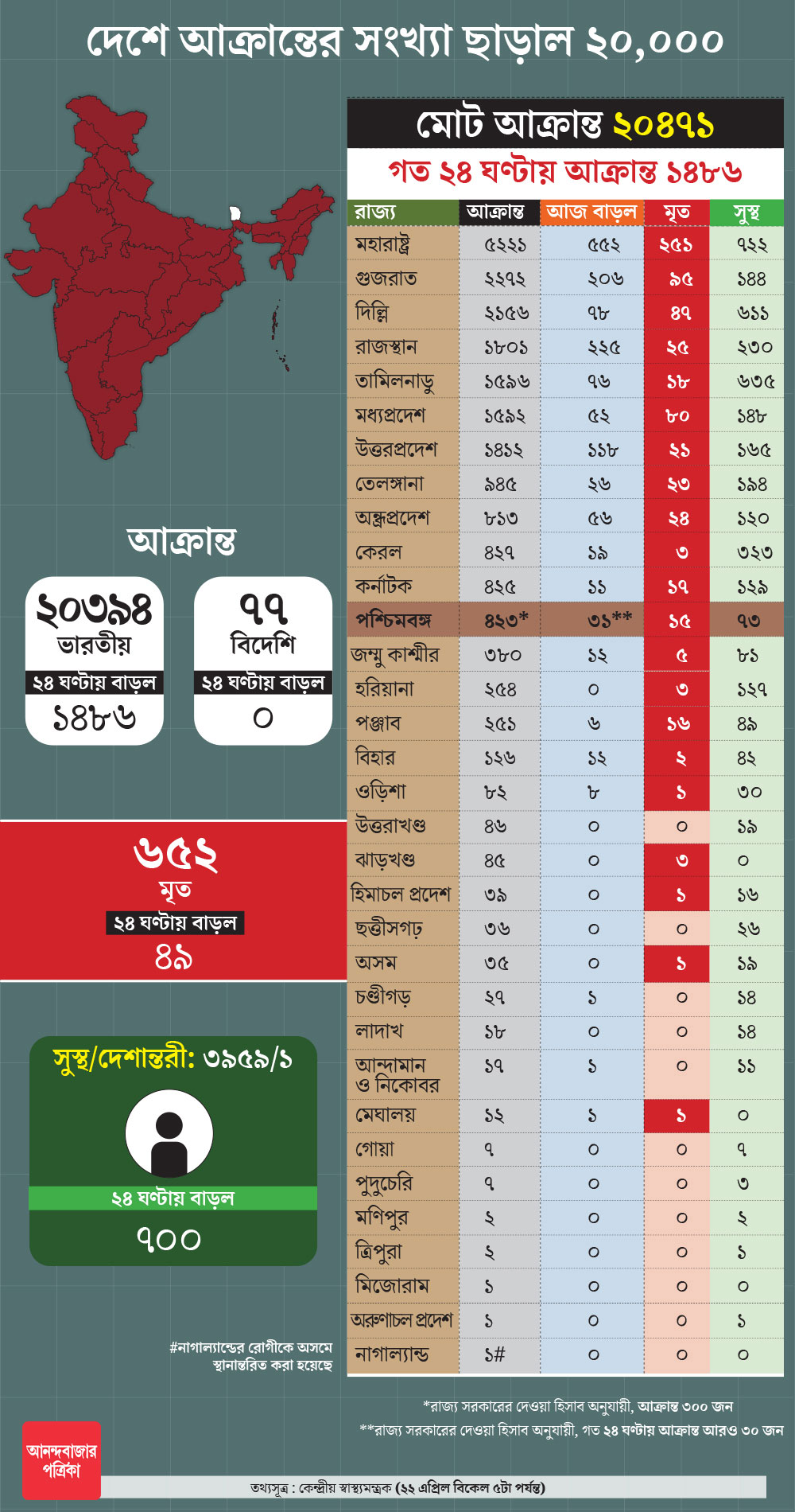 সারা দেশের মধ্যে করোনা সংক্রমণের সবচেয়ে ভয়াবহ ছবি উঠে আসছে মহারাষ্ট্র থেকে। সেখানে ৫ হাজার ২২১ জন সংক্রমণের শিকার হয়েছেন। মৃত্যু হয়েছে ২৫১ জনের। সেখানে চিকিৎসায় সুস্থ হয়ে উঠেছেন ৭২২ জন। এর পরেই রয়েছে গুজরাত। সেখানে আক্রান্ত হয়েছেন ২ হাজার ২৭২ জন। তৃতীয় স্থানে রয়েছে দিল্লি। সেখানে সংক্রমণের কবলে পড়েছেন ২ হাজার ১৫৬ জন। সংক্রমণের গণ্ডি দেড় হাজার ছাপিয়ে গিয়েছে মধ্যপ্রদেশ, রাজস্থান ও তামিলনাড়ুতেও। ১ হাজার ৪১২ জন সংক্রমিত হয়েছেন উত্তরপ্রদেশে। তেলঙ্গানায় করোনা আক্রান্ত ৯৪৫ জন।