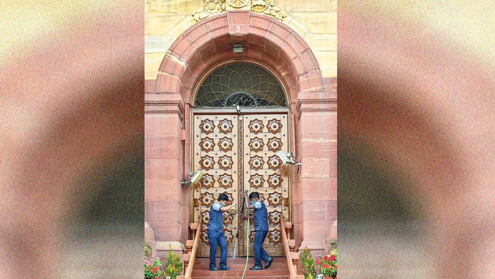 করোনা-ত্রাস: জীবাণুমুক্ত করার কাজ চলছে সংসদে ভবনে। শনিবার। ছবি: পিটিআই।