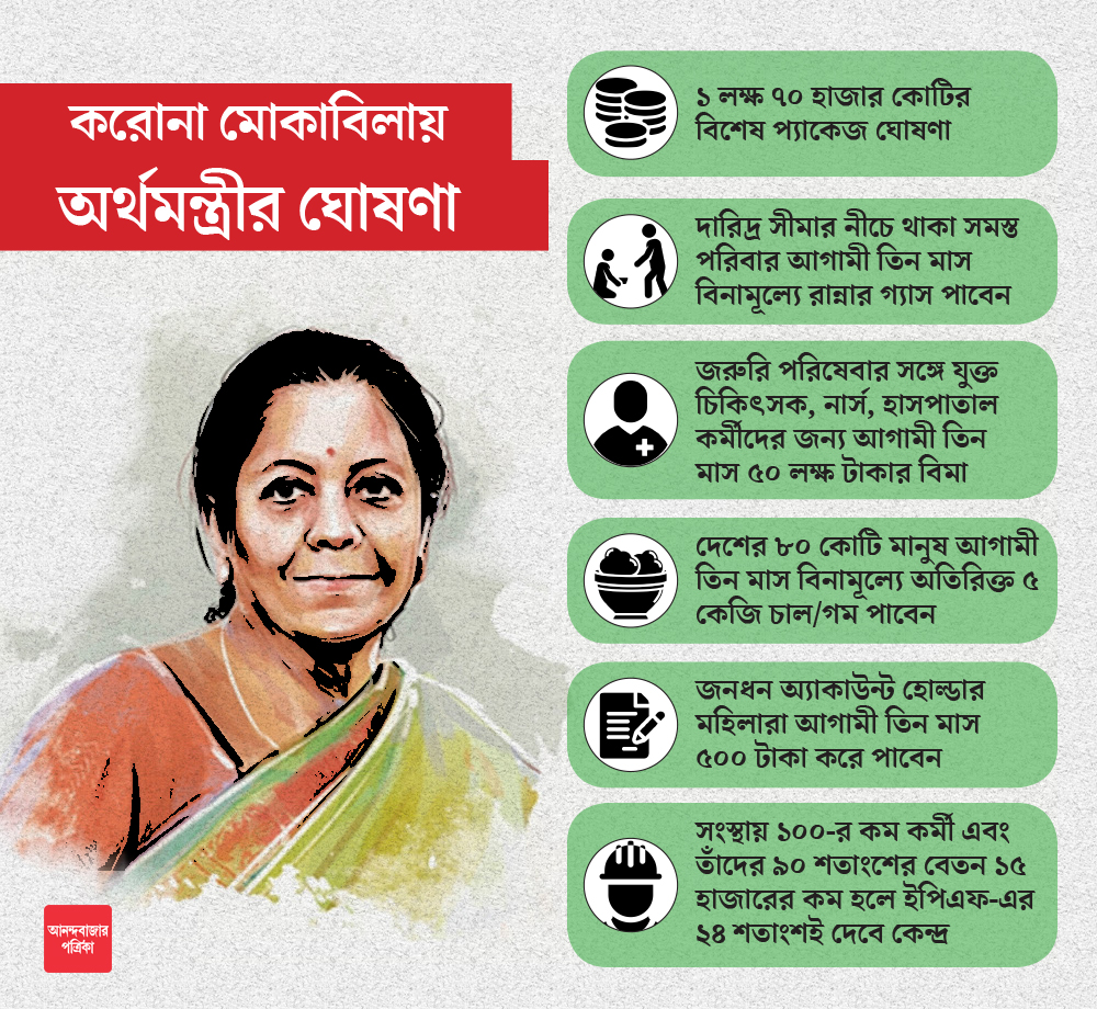 এ দিন দিল্লিতে সাংবাদিক বৈঠক করে একাধিক পদক্ষেপের কথা ঘোষণা করেন কেন্দ্রীয় অর্থমন্ত্রী নির্মলা সীতারামন এবং অর্থ দফতরের প্রতিমন্ত্রী অনুরাগ ঠাকুর। তাঁরা জানান, যে সমস্ত সংস্থার কর্মীসংখ্যা ১০০-র কম এবং সংস্থার ৯০ শতাংশ কর্মীর বেতন ১৫ হাজারের কম, তাদের হয়ে কর্মচারী প্রভিডেন্ট ফান্ডে ২৪ শতাংশ টাকাই জমা দেবে কেন্দ্র। অর্থাৎ নিয়োগকর্তা এবং কর্মী, দু’পক্ষের হয়েই কেন্দ্র টাকা দেবে।
