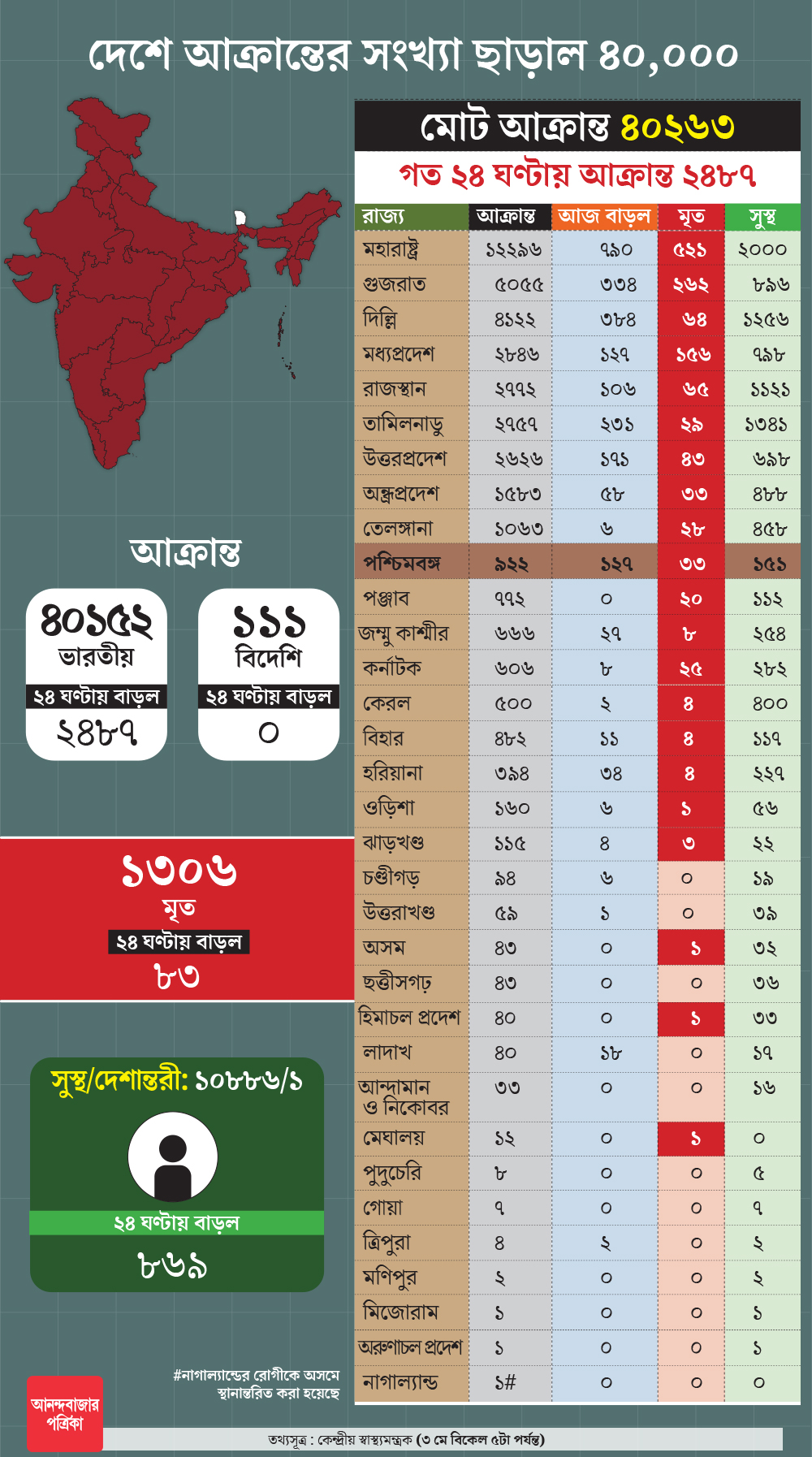 দেশে নোভেল করোনা আক্রান্তের সংখ্যা ৪০ হাজার ছাড়িয়ে গেল। কেন্দ্রীয় স্বাস্যমন্ত্রকের তরফে রবিবার বিকাল ৫টা পর্যন্ত যে হিসাব প্রকাশ করা হয়েছে, তাতে দেখা গিয়েছে দেশে এখনও পর্যন্ত ৪০ হাজার ২৬৩ জন কোভিড-১৯ ভাইরাসে আক্রান্ত হয়েছেন। এর মধ্যে সুস্থ হয়ে উঠেছেন ১০ হাজার ৮৮৬ মানুষ।
