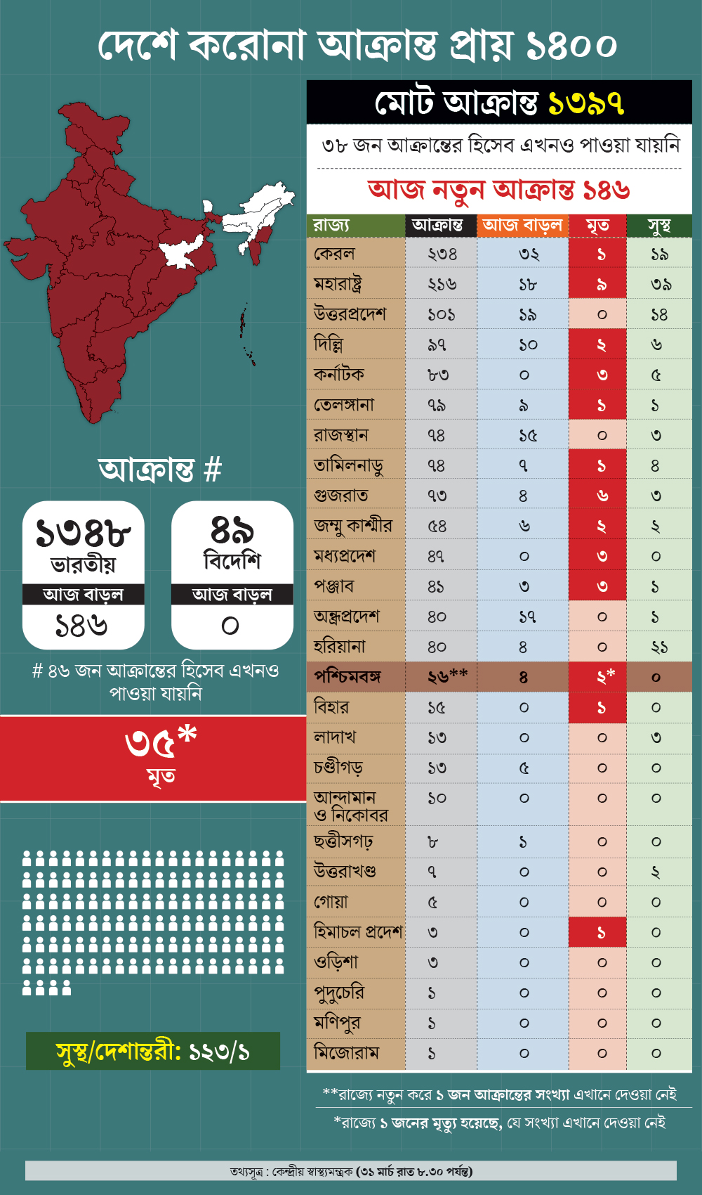 কেন্দ্রীয় স্বাস্থ্যমন্ত্রকের রিপোর্ট অনুযায়ী, পশ্চিমবঙ্গে আক্রান্তের সংখ্যা ২৬ জন। মৃত্যু হয়েছে ২ জনের। অন্য দিকে, গৃহ-পর্যবেক্ষণের সংখ্যা এক লাফে অনেকটাই বেড়ে গিয়েছে। রাজ্যের স্বাস্থ্য দফতরের রিপোর্ট অনুযায়ী, এ দিন নতুন করে ১০ হাজার ৩১৩ জনকে গৃহ-পর্যবেক্ষণে পাঠানো হয়েছে। ফলে গৃহ-পর্যবেক্ষণের সংখ্যাটা বেড়ে দাঁড়িয়েছে ৫৭ হাজার ৪০৪ জন।