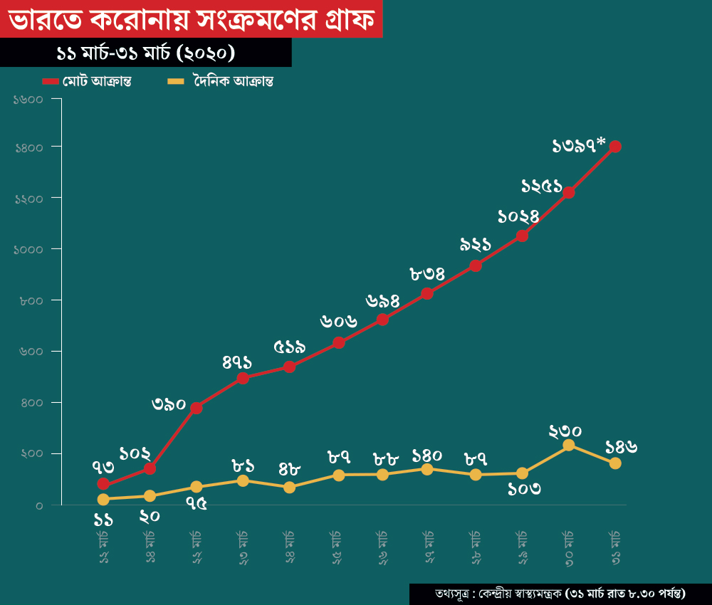 দেশে করোনা আক্রান্তের সংখ্যা বেড়ে দাঁড়াল ১৬৩৭। কেন্দ্রীয় স্বাস্থ্যমন্ত্রকের তথ্য অনুযায়ী, বুধবার নতুন করে ২৪০ জন আক্রান্ত হয়েছেন। গোটা দেশে মৃত্যু হয়েছে ৩৮ জনের। তবে আশার খবর এই যে, ইতিমধ্যেই ১৩২ জন সুস্থ হয়ে উঠেছেন।