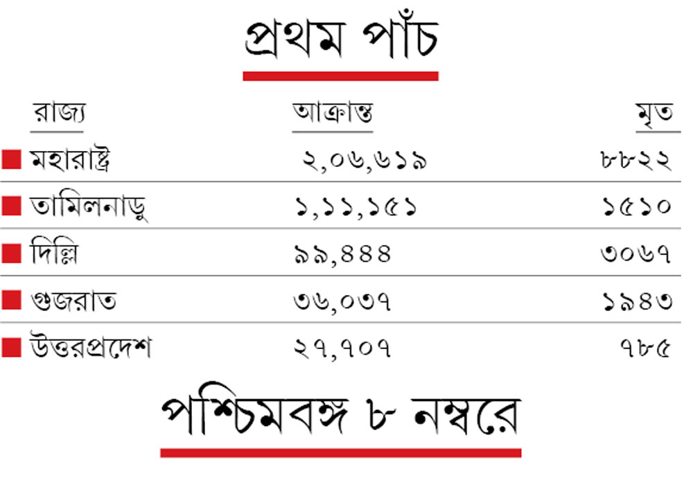 স্বাস্থ্য মন্ত্রকের দেওয়া পরিসংখ্যান বলছে, গত ২৪ ঘণ্টায় দেশে নতুন করে ২৪,২৪৮ জন কোভিড-১৯ আক্রান্ত হয়েছেন। ওই সময়ে করোনাভাইরাস প্রাণ কেড়েছে ৪২৫ জনের। স্বাস্থ্য মন্ত্রক এক বিবৃতিতে বলেছে, ‘‘৬০.৮৫ শতাংশ করোনা রোগী সুস্থ হয়ে উঠেছেন।’’ গত ২৪ ঘণ্টায় করোনায় সব চেয়ে বেশি মানুষ মারা গিয়েছেন মহারাষ্ট্রে (১৫১)। তার পরেই দিল্লি, সেখানে ২৪ ঘণ্টায় মৃতের সংখ্যা ৬৩। দিল্লিতে আক্রান্তের সংখ্যা এক লক্ষ ছুঁইছুঁই। এমনকি একটি পরিবারের ১১ জন সংক্রমিত হয়েছেন। যদিও দিল্লির মুখ্যমন্ত্রী অরবিন্দ কেজরীবাল বলছেন, ‘‘দিল্লিতে কোভিড-১৯ রোগাক্রান্তের সংখ্যা ১ লক্ষ ছাড়িয়েছে।’’