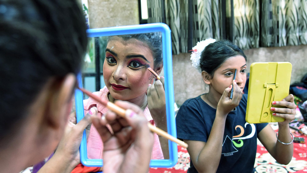 রামলীলার মঞ্চে ওঠার আগে মেপআপ নিচ্ছেন দুই অভিনেত্রী। ছবি: টুইটার থেকে নেওয়া