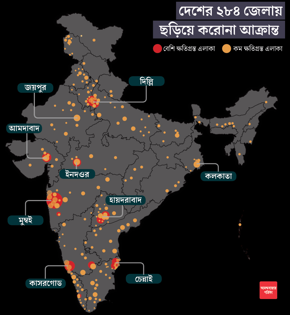কয়েকটি উদাহরণ দিলেই বিষয়টি স্পষ্ট হবে। ৮ এপ্রিল দক্ষিণ দিল্লিতে করোনা আক্রান্তের সংখ্যা ৩১৬-তে পৌঁছেছে। ওই সময় মুম্বইয়ে করোনায় আক্রান্তের সংখ্যা হযেছে ২৭৮। কাসরগোড জেলায় সংক্রমণের শিকার হয়েছেন ১২১ জন। ইনদওরে ৮ এপ্রিলের মধ্যে করোনা আক্রান্ত হয়েছেন ১১০ জন। অথচ তার ১৫ দিন আগে ওই সব এলাকায় সংক্রমণের সংখ্যা প্রায় ছিলই না।