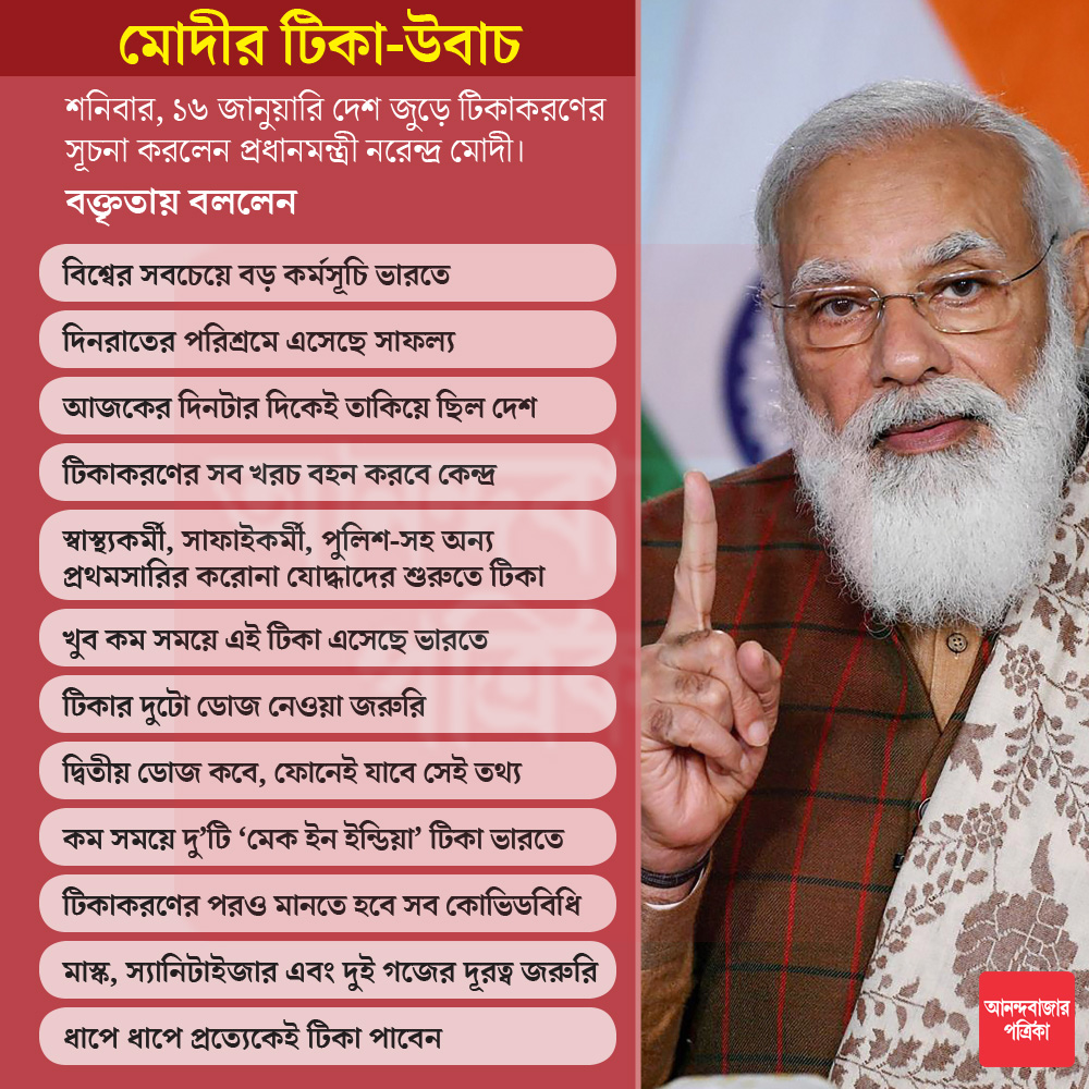 অতিমারির প্রকোপ কাটিয়ে উঠতে শনিবার, ১৬ জানুয়ারি দেশ জুড়ে টিকাকরণ কর্মসূচির সূচনা করলেন প্রধানমন্ত্রী নরেন্দ্র মোদী। শনিবার সকালে ভিডিয়ো বার্তায় এত কম সময়ের মধ্যে নোভেল করোনাভাইরাসের প্রতিষেধক আবিষ্কার করে নজির গড়ায় গবেষক এবং বিজ্ঞানীদের ধন্যবাদ জানান তিনি। তবে টিকাকরণ শুরু হলেও, সংক্রমণ থেকে বাঁচতে আগের মতোই সতর্কতা অবলম্বন করতে হবে বলে জানান তিনি। প্রধানমন্ত্রী সাফ জানিয়ে দেন, মাস্ক ব্যবহার এবং সামাজিক দূরত্ব বিধি মেনে চলায় কোনও ঢিলেমি চলবে না।