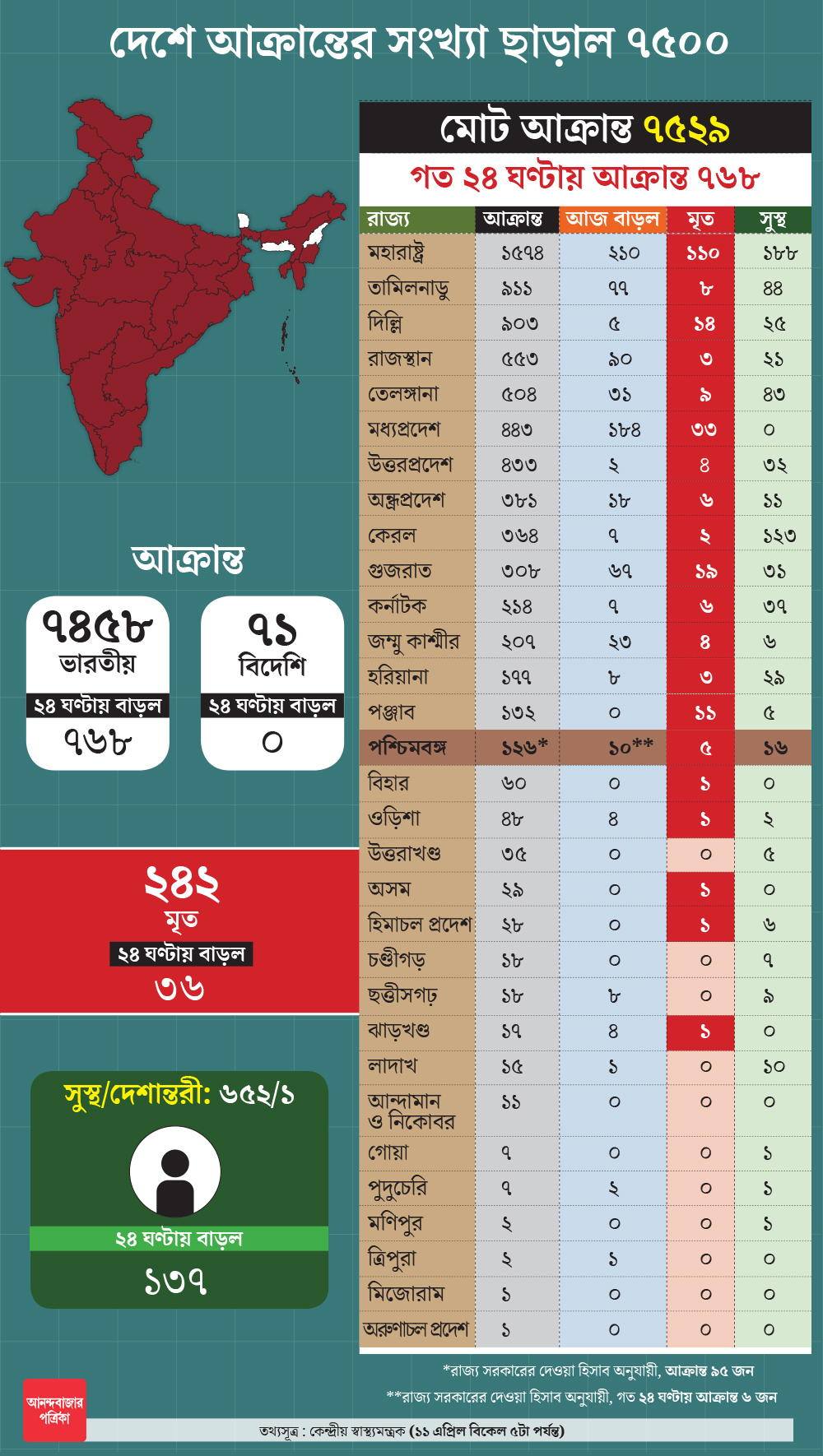 দেশে করোনাভাইরাসে আক্রান্তের সংখ্যা ৭৫২৯। গত ২৪ ঘণ্টায় দেশে করোনাভাইরাসে আক্রান্তের সংখ্যা বাড়ল ৭৬৮। মহারাষ্ট্রে আক্রান্ত হয়েছেন ১৫৭৪ জন। সারা দেশে এখন করোনা আক্রান্তের সংখ্যা দাঁড়িয়েছে ৭ হাজার ৫২৯ জন। চিকিৎসকদের মতে, দেশ জুড়ে করোনা পরীক্ষার সংখ্যা বেড়েছে। তার ফলে নতুন আক্রান্তরা সামনে আসছেন। মৃতের সংখ্যা এখন ২৪২ জন। গত ২৪ ঘণ্টায় মৃত্যু বাড়ল ৩৬।