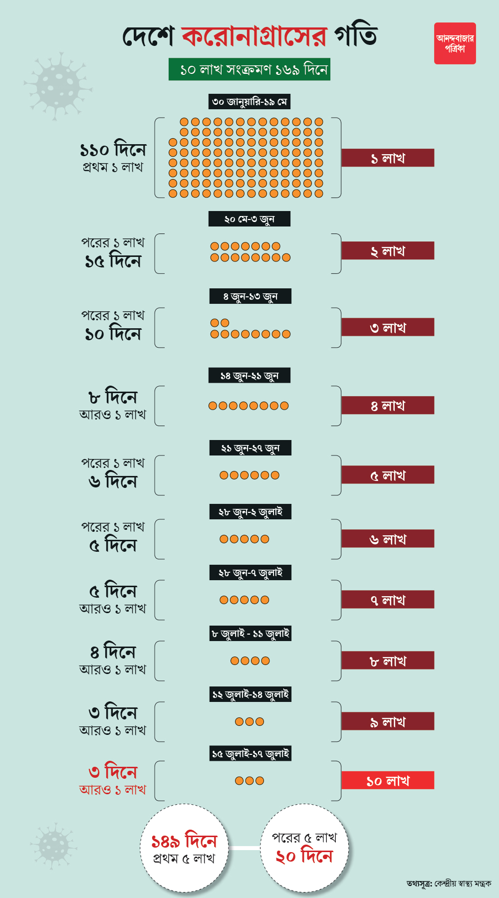 সেই দিক থেকে দেখলে অবশ্য এক লক্ষ থেকে দুই বা তিন বা দশ লক্ষে পৌঁছনোর মাঝের সময়ের ব্যবধানের তুলনা করা চলেনা। কিন্তু তবু আক্রান্তের সংখ্যা বৃদ্ধির প্রবণতা বুঝতে এটা সাহায্য করে। তাই আক্রান্তের সংখ্যা ১ লক্ষের গণ্ডিতে ভাগ করে দেখা যাচ্ছে ১ থেকে করোনা আক্রান্তের সংখ্যা ১ লাখে পৌঁছতে সময় লেগেছিল ১১০ দিন। এক লাখ থেকে দু’লাখে পৌঁছতে সেই সময় লেগেছে মাত্র ১৫ দিন। দুই থেকে তিন লাখে ১০ দিন, তিন থেকে থেকে চার লাখে ৮ দিন, চার থেকে পাঁচ লাখে ৬ দিন, পাঁচ থেকে ছ’লাখে ৫ দিন, ছয় থেকে সাত লাখে ৫ দিন, সাত থেকে আট লাখে ৪ দিন, আট থেকে ন’লাখে ৩ দিন সময় লেগেছে। শেষ ন’লাখ থেকে দশ লাখে পৌঁছতে অবশ্য আগের মতোই ৩ দিনই সময় লেগেছে। অর্থাৎ শেষ পাঁত লক্ষ সংক্রমণ হয়েছে মাত্র ২০ দিনে। এই সংক্রমণ বৃদ্ধির হার না কমলে এই ব্যবধান যে ক্রমেই কমতে থাকবে তা বলাই বাহুল্য। ফলে উদ্বেগ বাড়ছে সব মহলে।