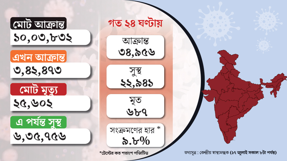 ২ জুলাই ৬ লাখ। ৭ জুলাই ৭ লাখ। ১১ জুলাই ৮ লাখ। ১৪ জুলাই ৯ লাখ। ১৭ জুলাই ১০ লাখ। এই পরিসংখ্যান দেশের করোনাভাইরাস সংক্রমণের। তারিখগুলোর মধ্যের ব্যবধান ক্রমেই কমছে ৫, ৪, ৩ দিন— এই ভাবে বাড়তে বাড়তে শুক্রবার দেশে করোনাভাইরাসে আক্রান্ত ছাড়িয়ে গেল ১০ লাখ। নতুন সংক্রমণের সংখ্যা রোজদিন বাড়ছে লাফিয়ে লাফিয়ে। শুক্রবার সকালে কেন্দ্রীয় স্বাস্থ্য মন্ত্রকের দেওয়া পরিসংখ্যানেও সেই একই প্রবণতা। গত ২৪ ঘণ্টায় ৩৪ হাজার ৯৫৬ জন নতুন করে সংক্রমিত হয়েছেন। ২৪ ঘণ্টার নিরিখে যা এখনও অবধি সর্বোচ্চ। এ নিয়ে দেশে মোট আক্রান্ত হলেন ১০ লক্ষ তিন হাজার ৮৩২ জন। আক্রান্তের সঙ্গে সংক্রমণের হারও ঊর্ধ্বমুখী। প্রতিদিন যে সংখ্যক মানুষের টেস্ট হচ্ছে, তার মধ্যে যত শতাংশের রিপোর্ট কোভিড পজিটিভ আসছে, সেটাকেই বলা হচ্ছে ‘পজিটিভিটি রেট’ বা সংক্রমণের হার। গত ২৪ ঘণ্টায় দেশে সংক্রমণের হার ৯.৮ শতাংশ।