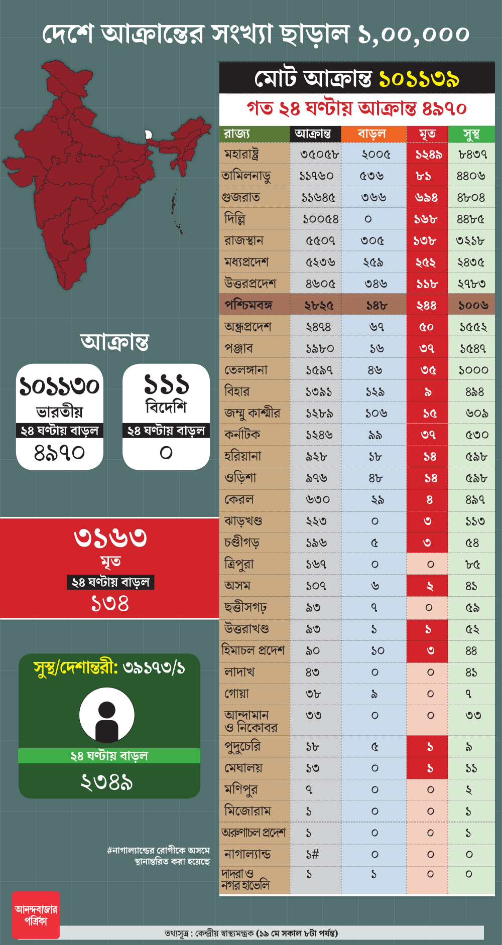 এ দেশে করোনায় আক্রান্ত রাজ্যগুলির মধ্যে শীর্ষে রয়েছে মহারাষ্ট্র। দেশের করোনা আক্রান্তের এক তৃতীয়াংশেরও বেশি সেখানে। এই মুহূর্তে মহারাষ্ট্রে করোনাভাইরাসে আক্রান্ত ৩৫ হাজার ৫৮ জন। সেখানে মৃত্যু হয়েছে এক হাজার ২৪৯ জনের। এর পরেই রয়েছে তামিলনাড়ু। সেখানে আক্রান্তের সংখ্যা ১১ হাজার ৭৬০ জন। আক্রান্তের নিরিখে তৃতীয় স্থানে গুজরাত (১১,৭৪৫) ও চতুর্থ রাজধানী দিল্লি (১০,০৫৪)। তার পর ক্রমান্বয়ে রয়েছে রাজস্থান (৫,৫০৭), মধ্যপ্রদেশ (৫,২৩৬), উত্তরপ্রদেশ (৪,৬০৫), পশ্চিমবঙ্গ(২,৮২৫), অন্ধ্রপ্রদেশ (২,৪৭৪)।