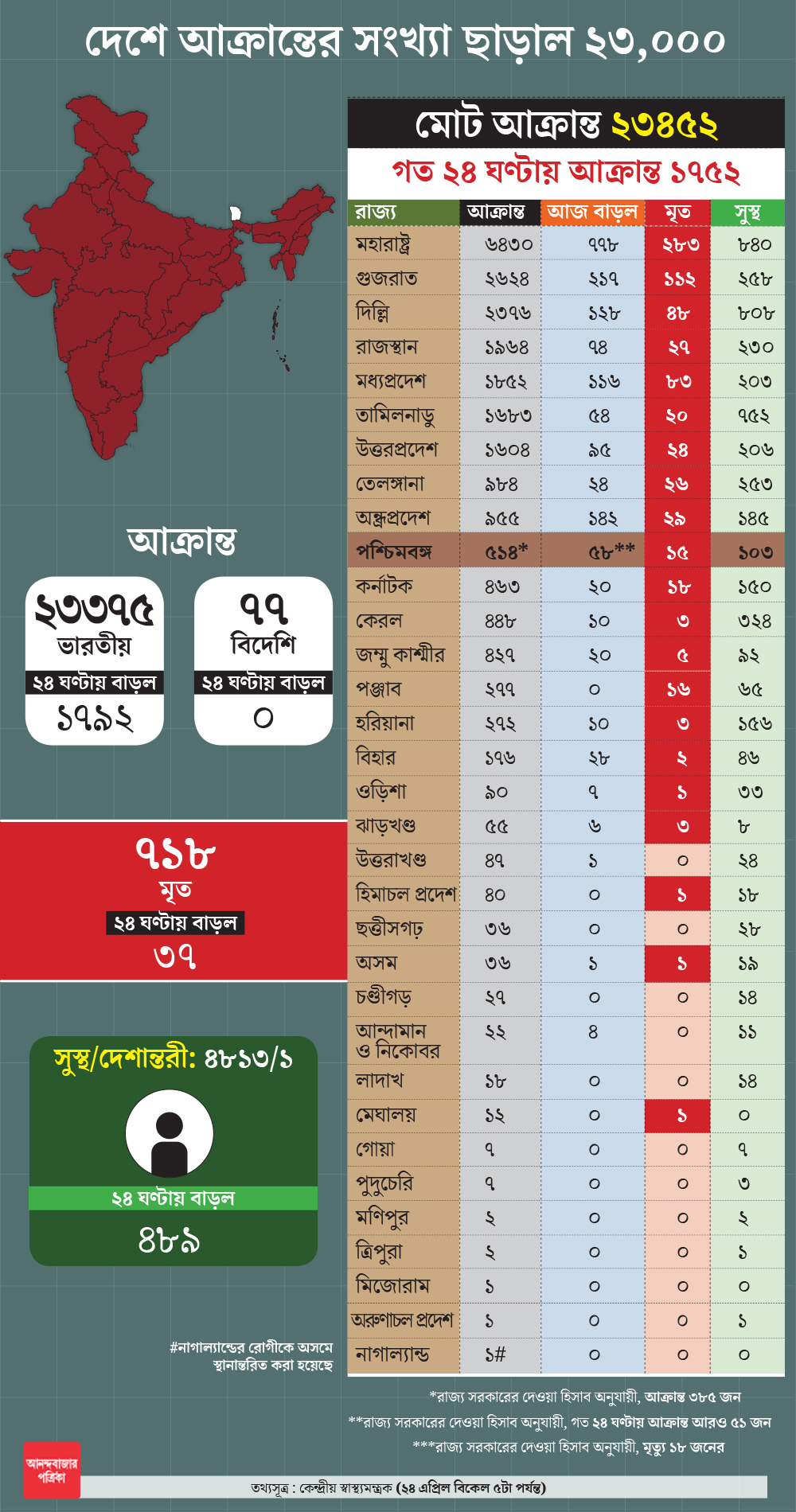 এক দিনে সর্বোচ্চ করোনা-আক্রান্তের নিরিখে ফের নয়া রেকর্ড গড়ল ভারত। গত ২৪ ঘণ্টায় দেশে নতুন করে ১ হাজার ৭৫২ জন করোনাভাইরাসে আক্রান্ত হয়েছেন। তাতে এক লাফে দেশে মোট আক্রান্তের সংখ্যা গিয়ে ঠেকেছে ২৩ হাজার ৪৫২-তে। গত ২৪ ঘণ্টায় করোনা সংক্রমণের জেরে ৩৭ জনের মৃত্যু হয়েছে। এর ফলে দেশে করোনা-আক্রান্তের মোট মৃত্যু-সংখ্যা গিয়ে ঠেকল ৭২৩-এ।