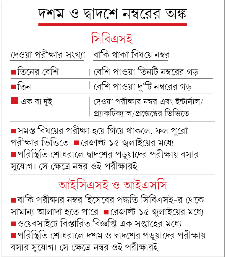 নীতিগত ভাবে সিবিএসই-র সিদ্ধান্ত অনুসরণের কথাই বলেছে আইসিএসই। তবে তাদের আইনজীবী জয়দীপ গুপ্ত জানান, বাতিল হওয়া বিষয়ের নম্বর ঠিক করতে হিসেব সামান্য আলাদা হতে পারে। রাতে আইসিএসই বোর্ডের সচিব জানান, যে পরীক্ষাগুলো হল না সেই পরীক্ষার নম্বর কী পদ্ধতিতে দেওয়া হবে, তা এক সপ্তাহের মধ্যে সংসদের ওয়েবসাইটে জানিয়ে দেওয়া হবে।