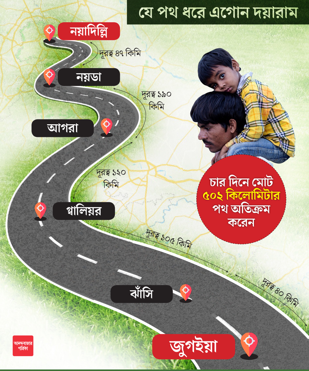 সেই ভরসাতেই বাকিদের সঙ্গে রাস্তায় নেমে পড়েন দয়ারাম ও জ্ঞানবতী। ছেলেকে কাঁধে নিয়ে আগে আগে হেঁটে চলেন দয়ারাম। সম্বলটুকু বস্তায় ভরে মাথায় তুলে পিছু পিছু জ্ঞানবতী। ক্লান্ত হয়ে পথের ধারে জিরিয়ে নিতে গেলে লাঠি হাতে তেড়ে আসে পুলিশ। তাই কখনও পাকা আবার কখনও কাঁচা রাস্তা দিয়ে শরীরটাকে টেনে হিঁচড়ে এগিয়ে নিয়ে যেতেই হয়। হাত দেখালে কখনও সখনও লরি বা ট্রাক তুলে নেয় তাঁদের। কিছুটা এগিয়ে আবার নামিয়ে দেয়। এ ভাবেই চারদিন ধরে কখনও হেঁটে, কখনও বা লরির পিছনে উঠে দিল্লি থেকে ৫০২ কিলোমিটার পাড়ি দিয়ে বাড়ি পৌঁছন দয়ারাম ও জ্ঞানবতী।